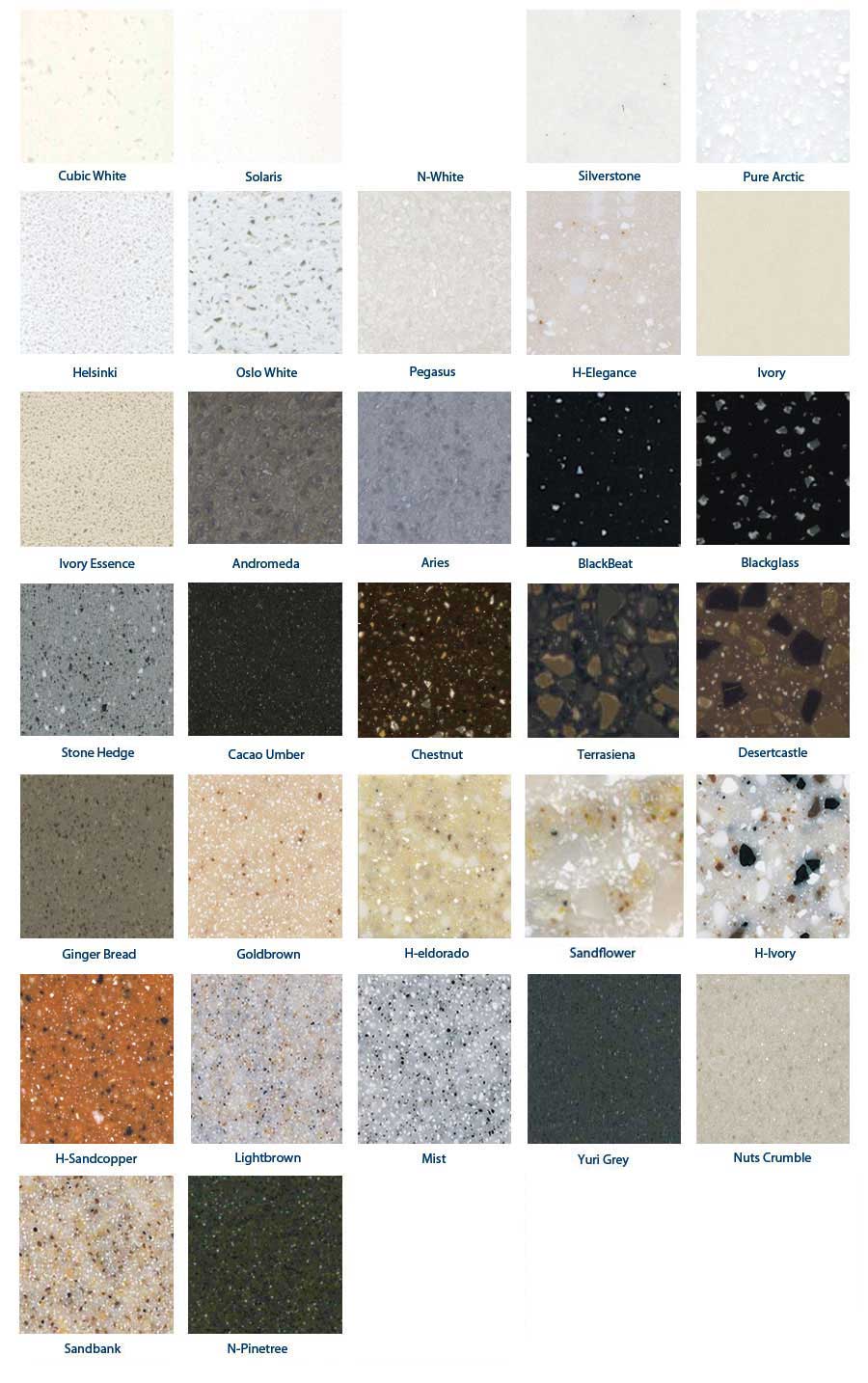 Искусственный камень производят из минерального наполнителя, полимерного связующего, красителейи модифицирующих добавок. Разные технологии предусматривают разное соотношение этих компонентов, использование разных видов наполнителя и связующего, отсюда и отличия в тех видах искусственного камня, из которых сегодня производят столешницы. Основные из них: