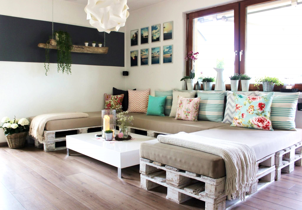 Более экономным вариантом из вышеперечисленных может оказаться создание предметов интерьера из уже отслуживших в быту вещей. Наиболее распространенный вариант – применение поддонов. Они скрепляются между собой, образуя спинку и сиденье. Для смягчения сиденья, как правило, используются матрас и подушки.
