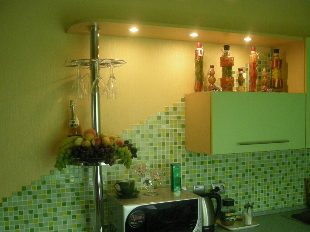 Для оформления данной зоны можно использовать битую керамику, мозаику, декор с фруктами, овощами или лепными элементами, которые станут очень уютным и эксклюзивным решением, чтобы оживить пространство над плитой.