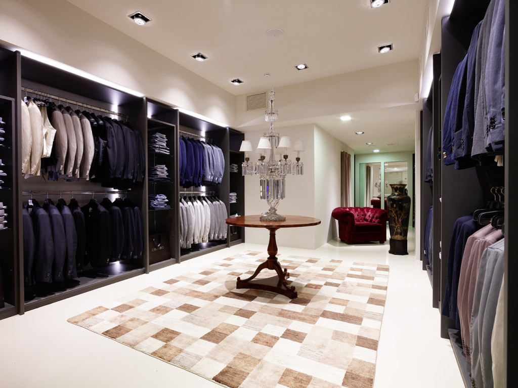 Далеко не последнюю роль в формировании целостности дизайна магазина мужской одежды отыгрывает освещение. При грамотном создании дизайн-проекта Вы можете добиться динамично изменяющейся обстановки – это окажется выгодно при регулярной смене коллекции одежды.