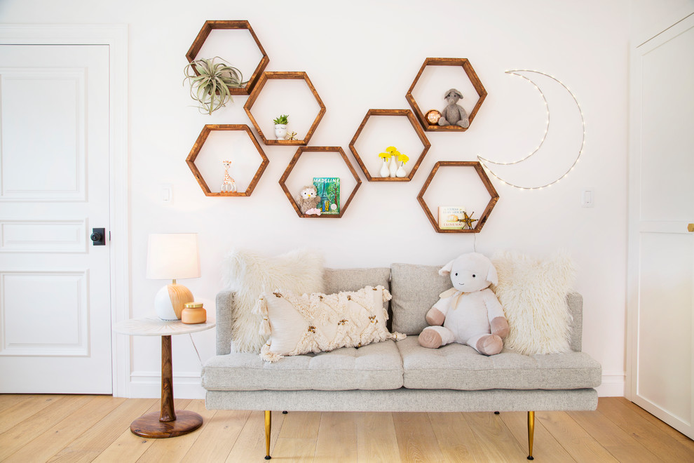 Нейтральный светло-серый диван на два места в комнате грудного ребенка, который пока спит в кроватке. Отличный, очень универсальный в плане будущего оформления комнаты, выбор «на вырост»