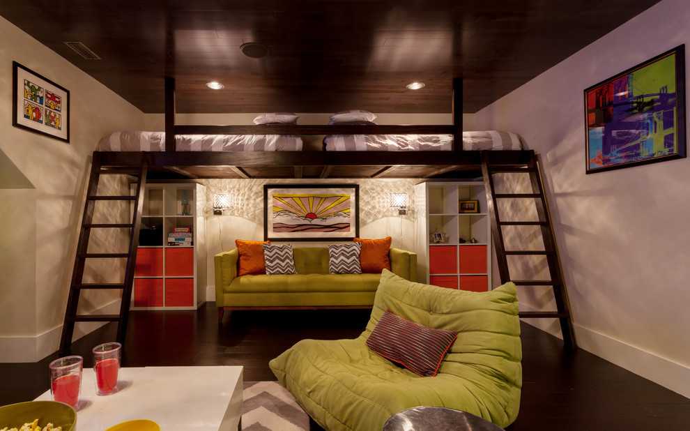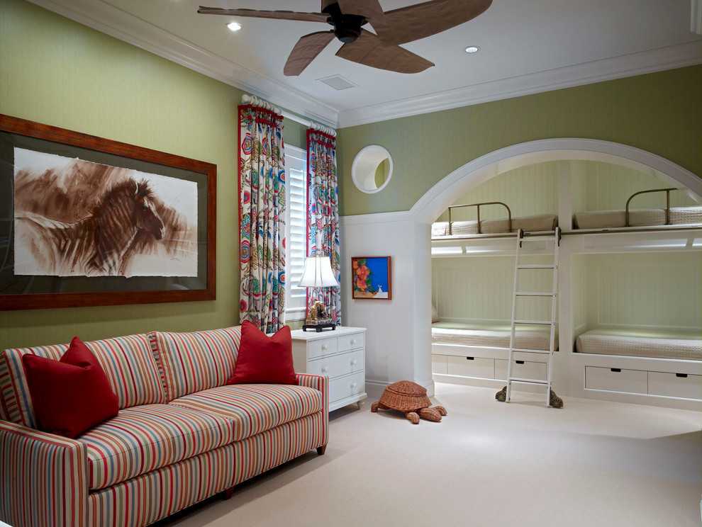 Двухъярусный диван-трансформер – это мебель для маленькой детской комнаты с двумя жильцами. На день конструкция убирается в нишу, составляя единое целое со стеной. Ночью спальные места выдвигаются, и дети с удовольствием на них засыпают.