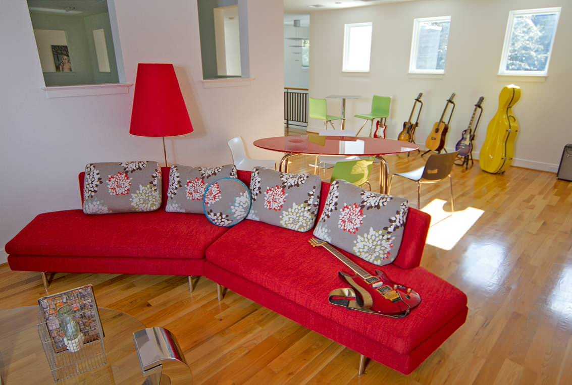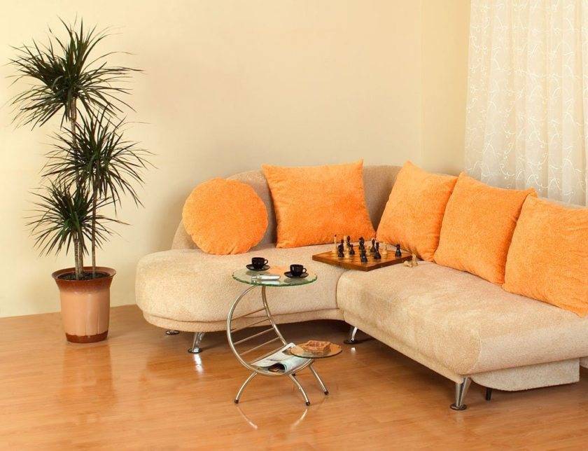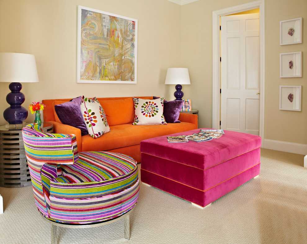 Чтобы сделать мягкую мебель акцентом обстановки, следует использовать яркий цвет обивки и нейтральную отделку в качестве фона. Красный превосходно сочетается с белыми стенами. Желтые и оранжевые оттенки повышают настроение и добавляют в интерьер уюта. Зелёная или салатовая обивка перекликается с природными мотивами.