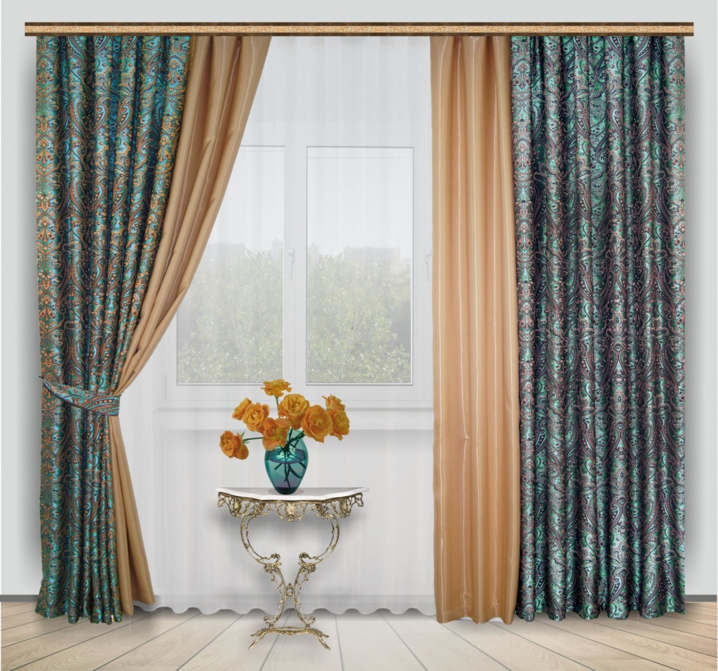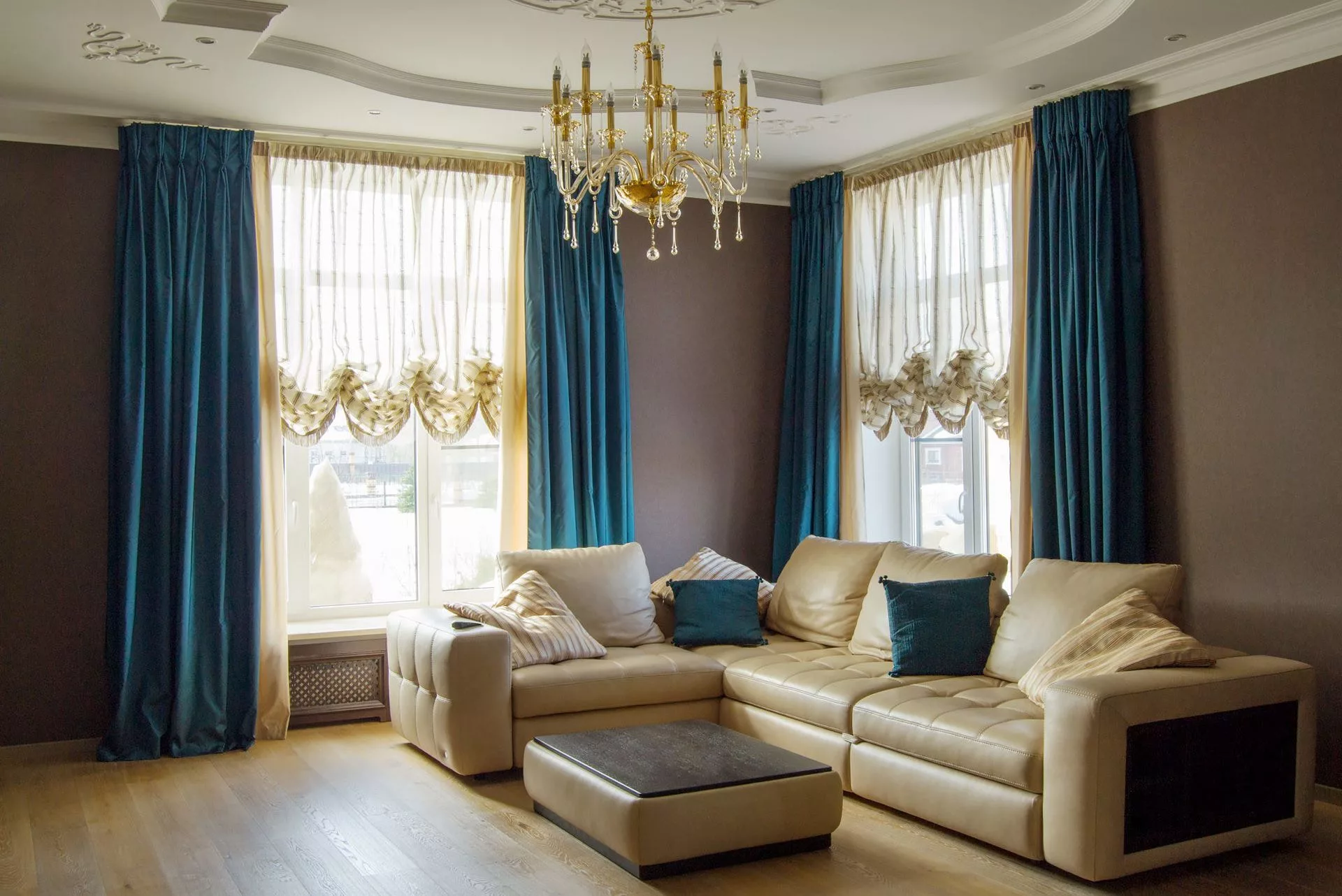 Заметно изменить оформление любой комнаты позволят портьеры насыщенных синих, бежевых, коричневых или зеленых цветов.