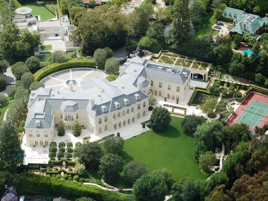 Резиденция в стиле французского шато построена в престижном пригороде Лос-Анджелеса, Холмби-Хиллс. Ранее принадлежала американскому продюсеру Аарону Спеллингу, а после того как его вдова выставила поместье на продажу, перешел к дочери основателя “Формулы-1” Петре Экклстоун.Общая площадь – 3390 кв. м, сюда входят 123 комнаты (гардероб супруги бывшего владельца занимал отдельное крыло). На территории имеются: стоянка на 100 автомобилей, 8 гаражей, 12 фонтанов, боулинг, бассейн, каток, домашний театр, кинотеатр, гимнастический зал, целых 4 бара, музей кукол и даже отдельный зал для подарков.
