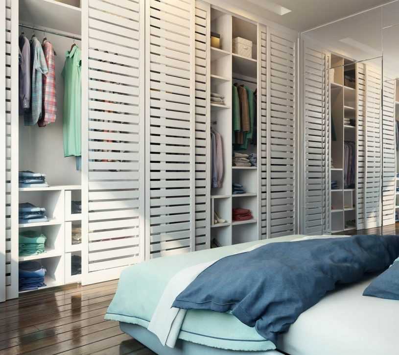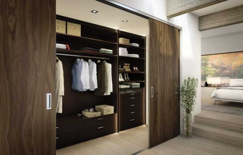 Существует много практичных решений. Например, при наличии в комнате ниши гардеробную помещают внутрь нее и закрывают несколькими секциями раздвижных дверей. Для внутреннего наполнения используют разнообразные системы хранения.