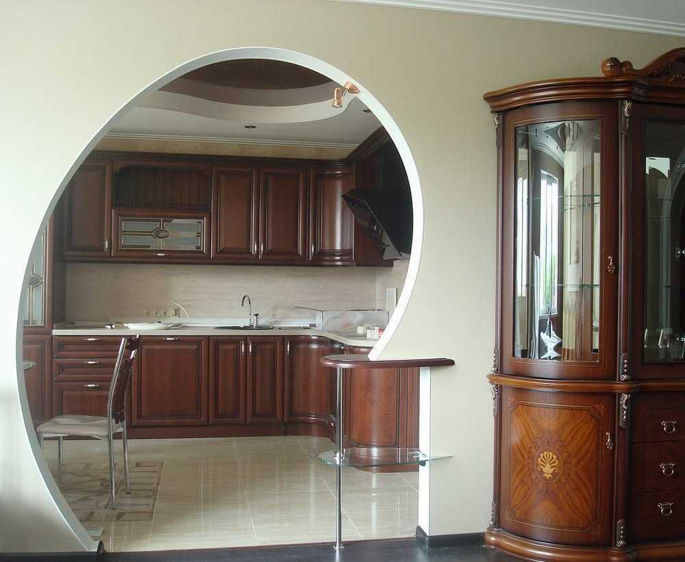 Не следует забывать о декорировании арочных проемов. При установке арки на большой площади можно дополнить ее перегородкой, которая сможет выполнять функцию барной стойки или местом для расположения различных аксессуаров. Такая перегородка гармонично впишется в классический стиль вашей кухни. Чтобы проем соответствовал кухонному интерьеру, рекомендуется декорировать его в одном стиле с кухонной мебелью или столешницей.