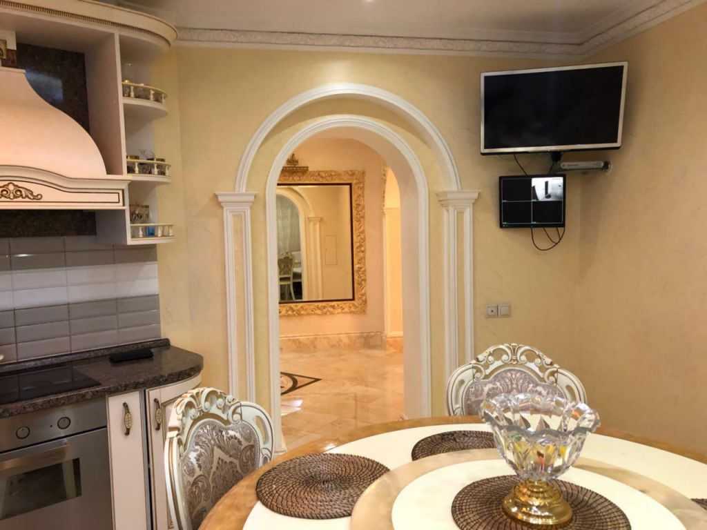 Кухню в античном стиле гармонично дополнит арка с лепниной, оформленная в единой цветовой гамме с кухней. Арочный проем в виде колон, украшенных лепниной, также идеально подойдет для античной кухни.
