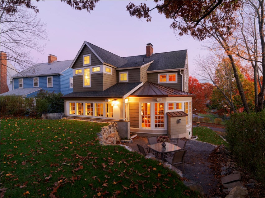 - Дом с эркером – вариант для эстетов. Большинство уютных картинок загородных домов представляют именно этот тип построек. Чаще всего в эркере располагается зимний сад, зона гостиной или столовой. Такой дом смотрится роскошно и элегантно.