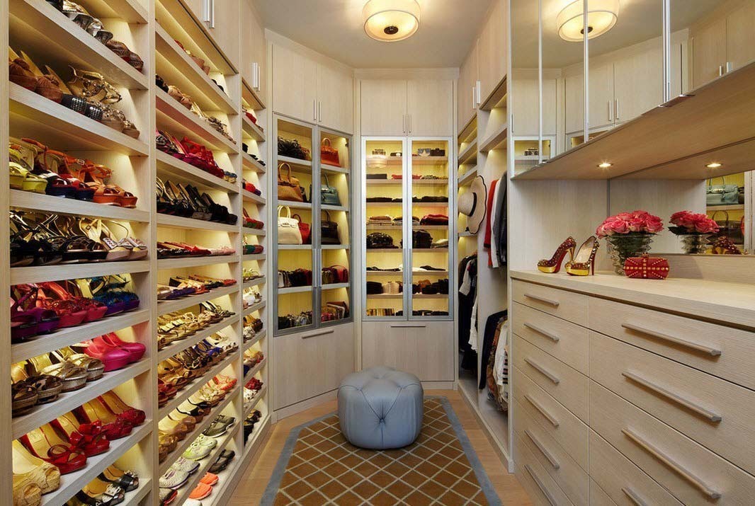 Гардеробная комната — наиболее удачное место для размещения всей имеющейся обуви — от сапог до домашних тапочек. Для неё должны быть предусмотрены специальные, отдельные конструкции. Очень удобно расположить различные типы обуви по секциям под соответствующей одеждой, кроссовки под спортивным костюмом, а туфли под платьями. Женские сапоги с высоким голенищем лучше подвешивать на специальные вешалки с зажимами, тогда вы избежите полос и следов сгиба. Невысокие ботинки, кроссовки и туфли можно хранить на выдвигающихся полках, чтобы было удобно выбрать нужную пару.