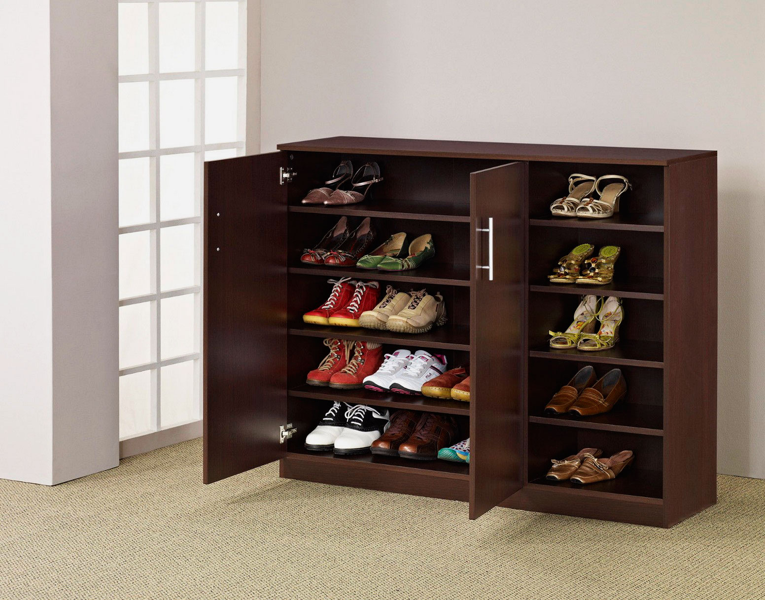 Стеллажи рассчитаны на хранение большого количества пар. Такие установки прекрасно вписываются в интерьер. Не обязательно устанавливать стеллаж в коридоре или гардеробной, дизайнеры советуют добавлять их в интерьер спальни или другой комнаты.