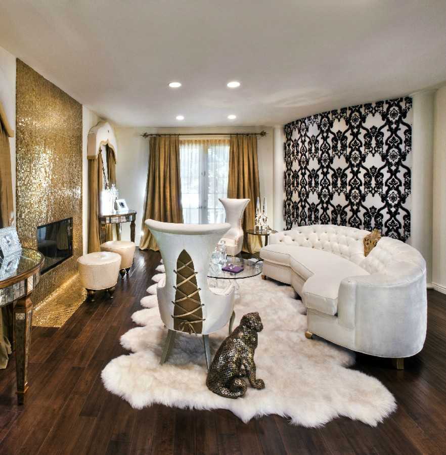 Обилие позолоченных декоративных элементов в гостиной подчеркнет высокий статус владельцев. Для отделки стен используйте декоративную штукатурку или тканевые обои. Сегодня на рынке легко найти обои в стиле барокко со сложными орнаментами и узорами.