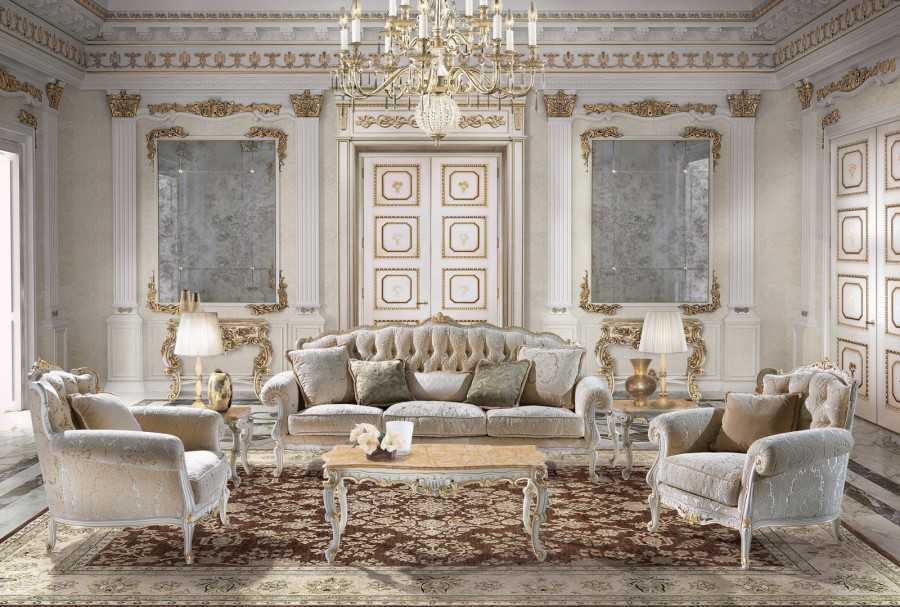 Интерьер барокко отличает обивка из добротной ткани, бахрома, изогнутые линии, высокие ножки. Диван дополняется парными креслами, стол украшен резьбой или мозаикой, стулья обязательно с резными спинками. Кровать выбирается большого размера, двухдверный шкаф, буфет и оттоманки возле кресел.