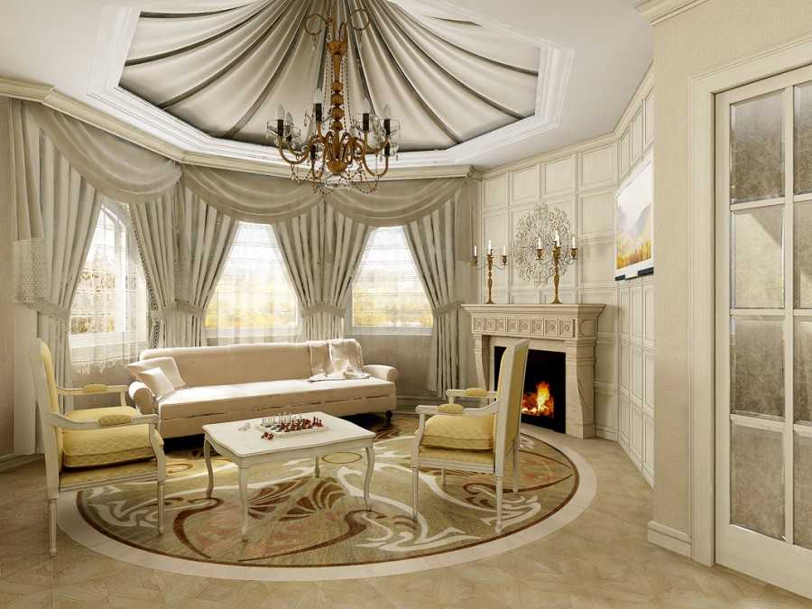 В качестве элементов декора отлично подойдут различные скульптуры, картины в больших рамах, напольные вазы и зеркала. А окна гостиной украшаются тяжелыми портьерами со сложной драпировкой.