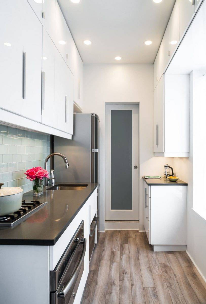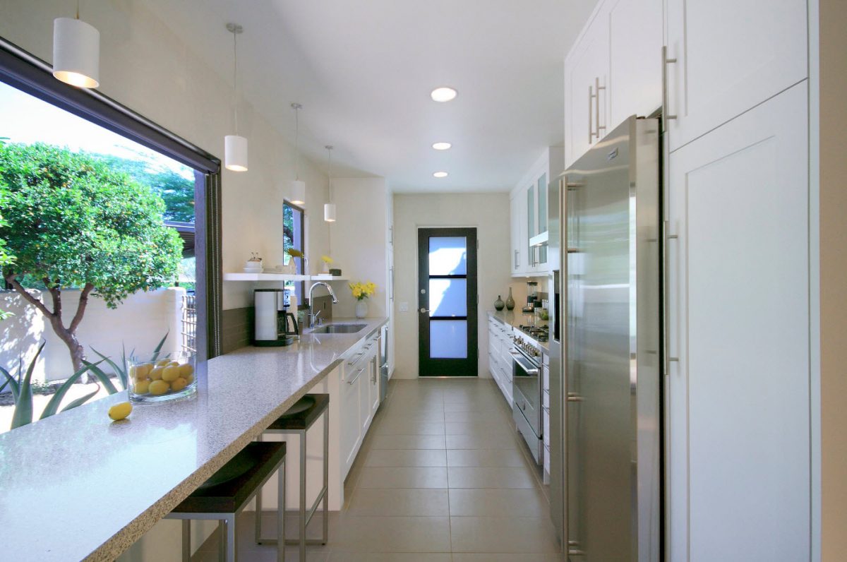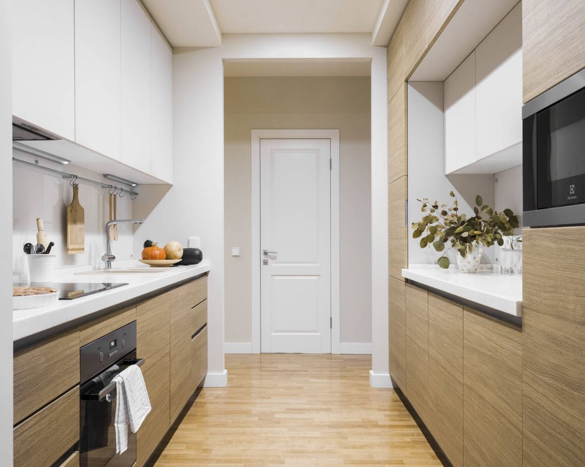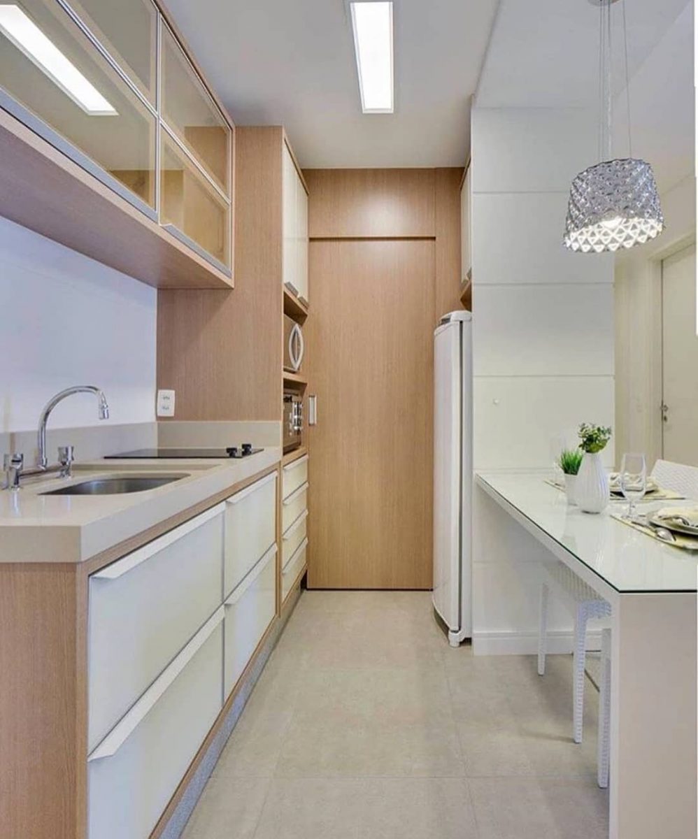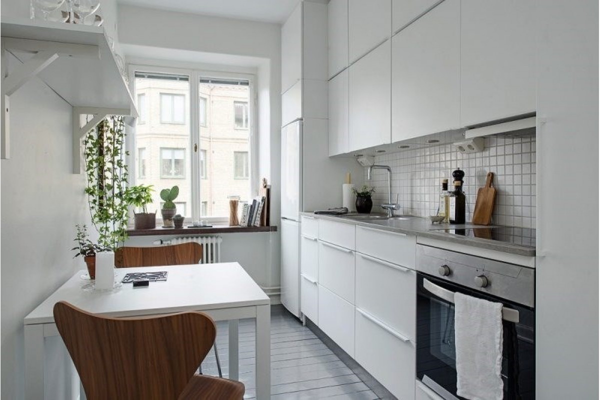Дизайн узкой в конце имеет свои преимущества. Под ним можно обустроить обеденную зону, а гарнитур сдвинуть ближе к двери. К плюсам линейной планировки относятся: