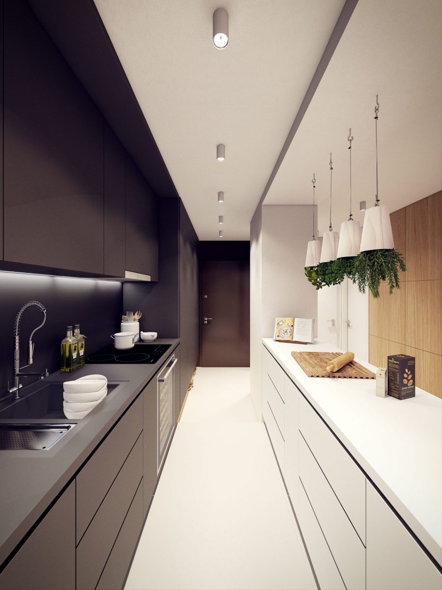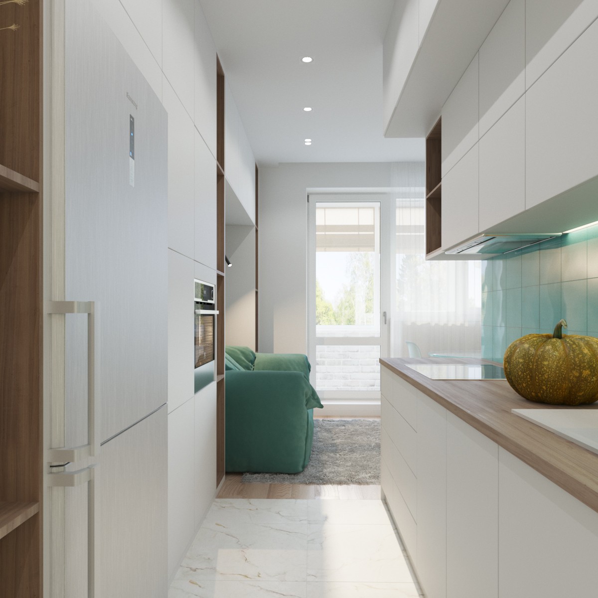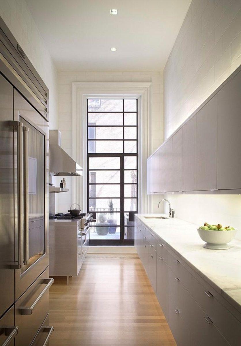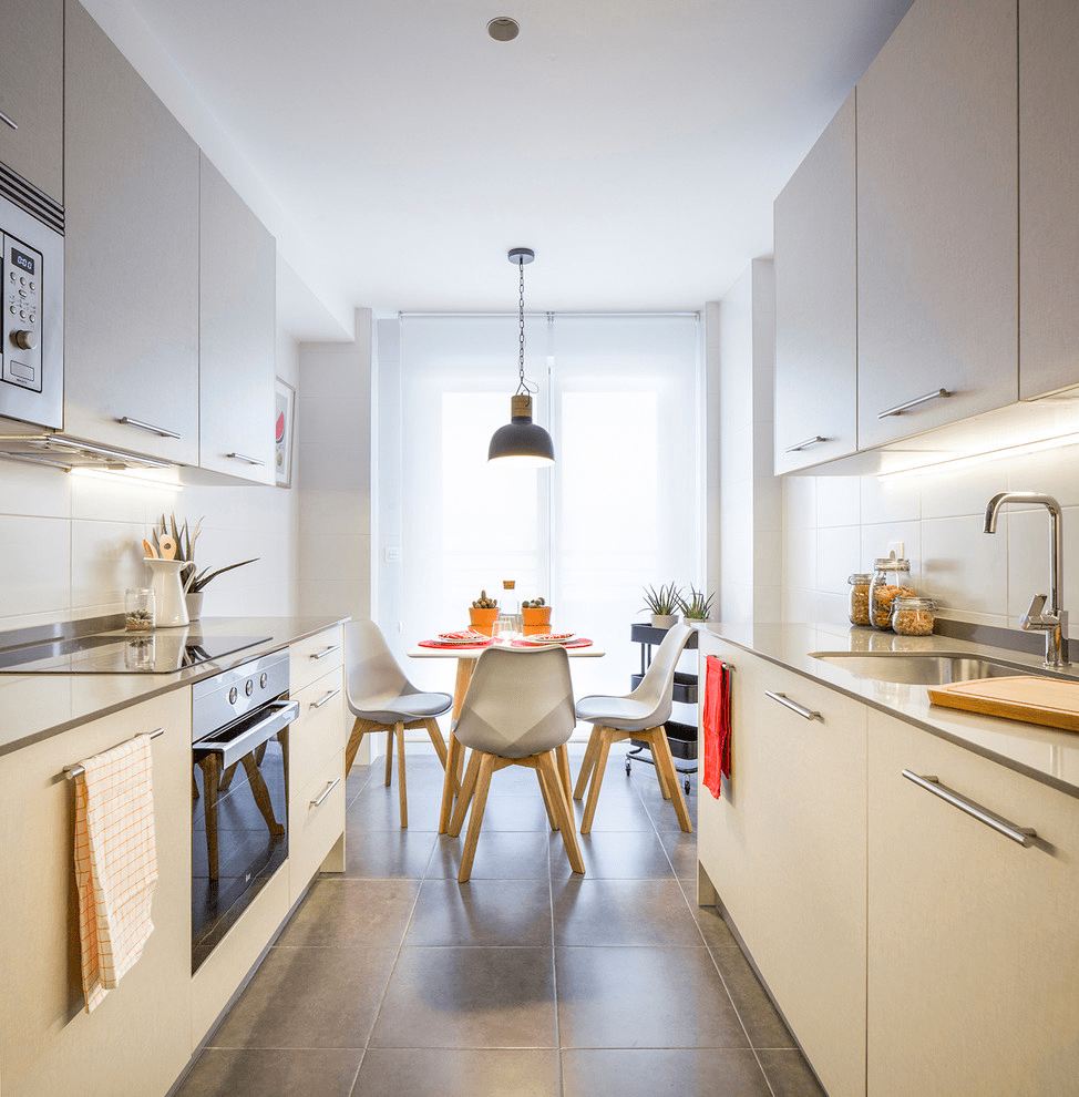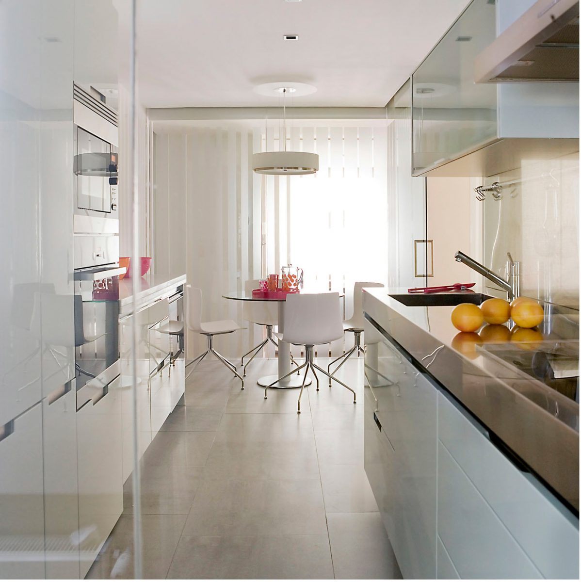 Дизайн узкой в конце имеет свои преимущества. Под ним можно обустроить обеденную зону, а гарнитур сдвинуть ближе к двери. К плюсам линейной планировки относятся: