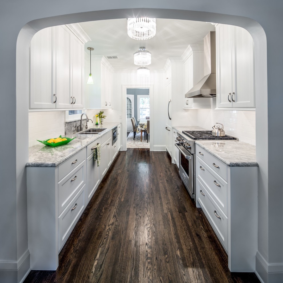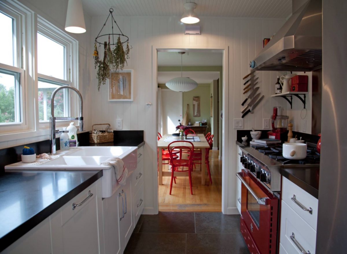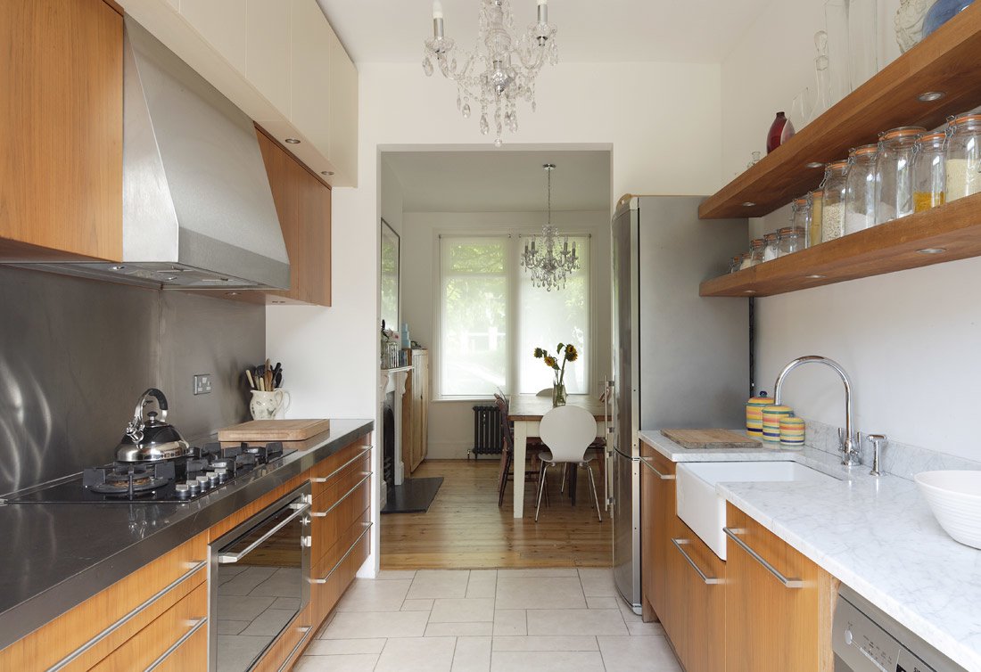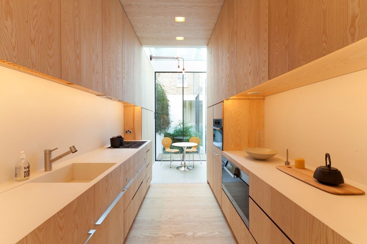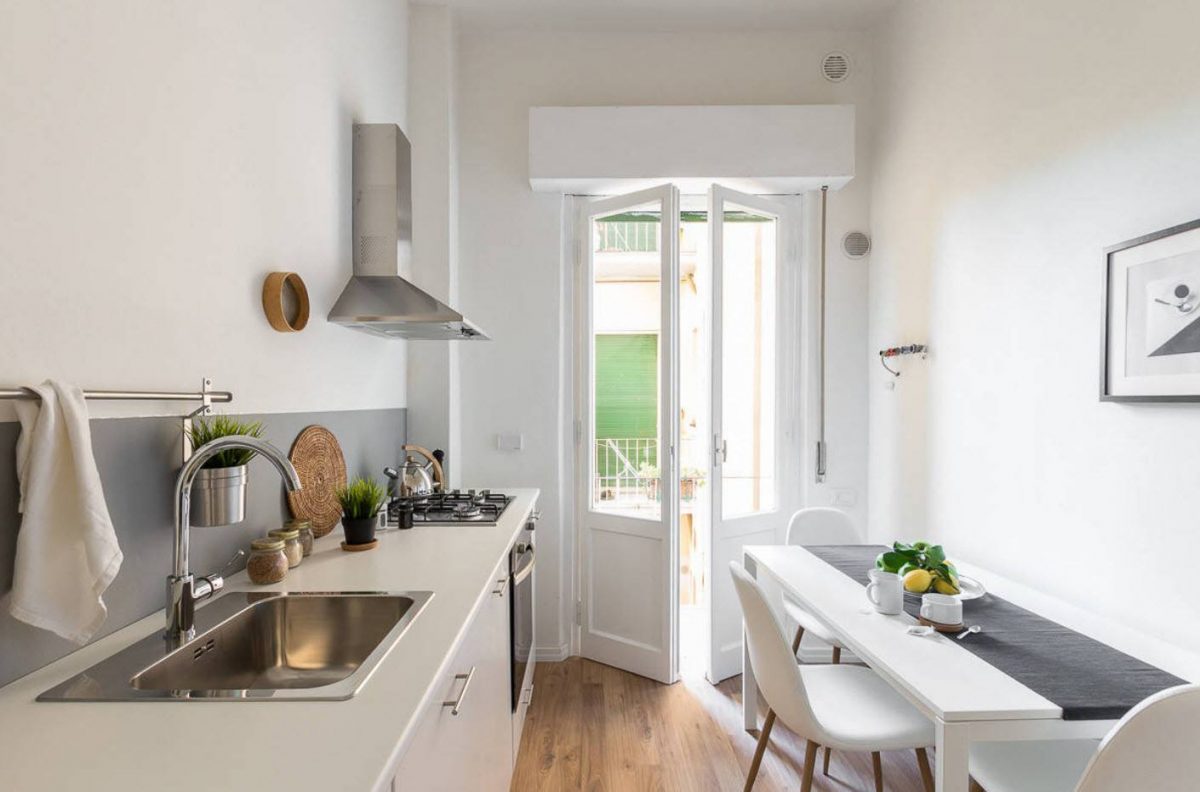 Дизайн узкой в конце имеет свои преимущества. Под ним можно обустроить обеденную зону, а гарнитур сдвинуть ближе к двери. К плюсам линейной планировки относятся: