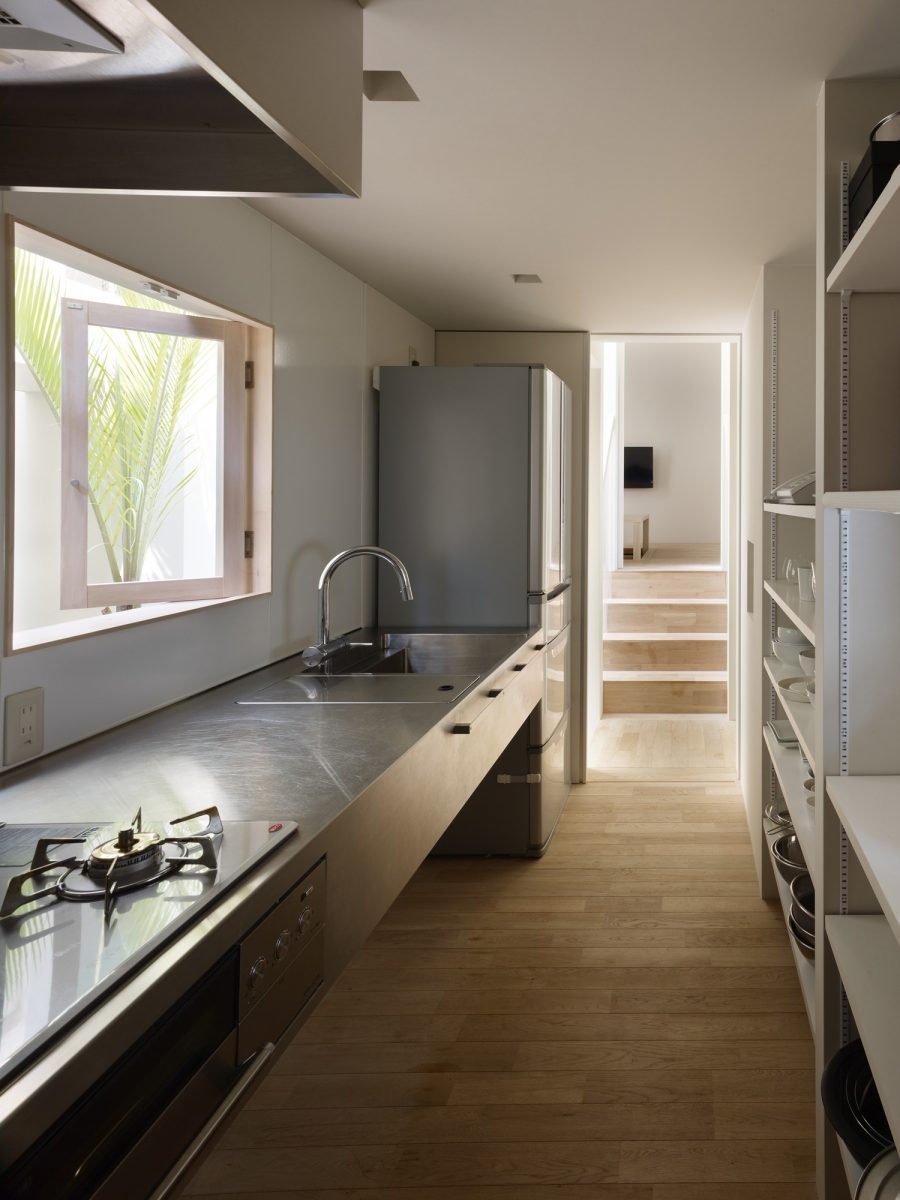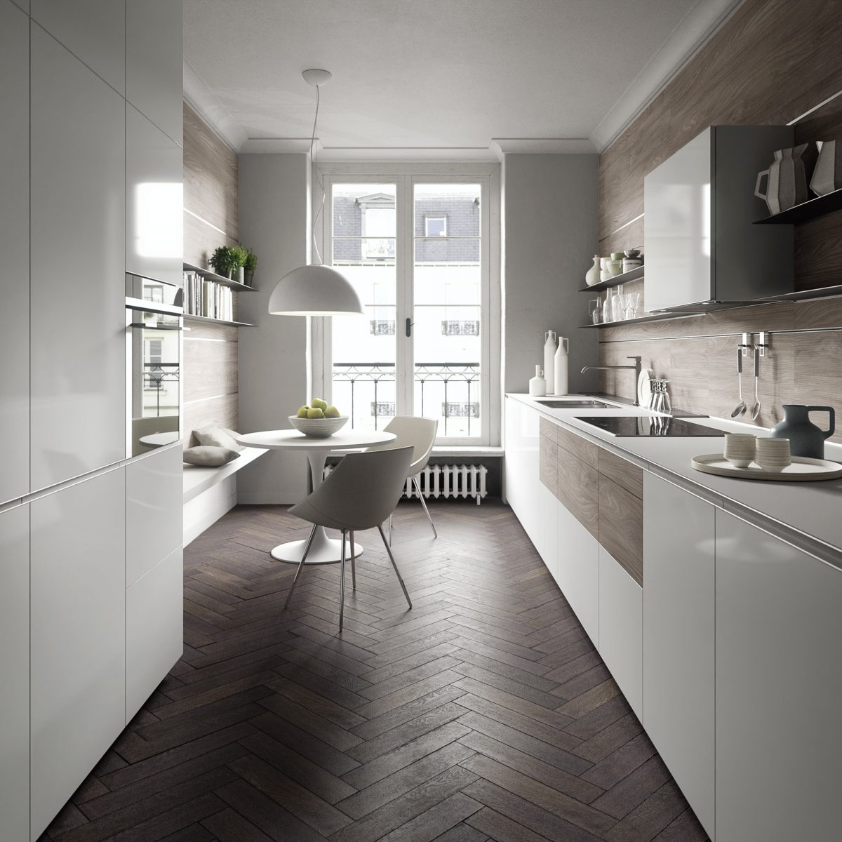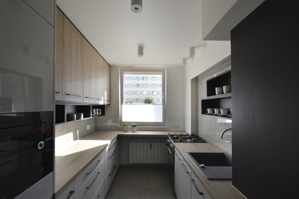 На выбор планировки также влияет расположения окна. В маленькой узкой кухне с окном в торце прямая планировка является единственным возможным решением.