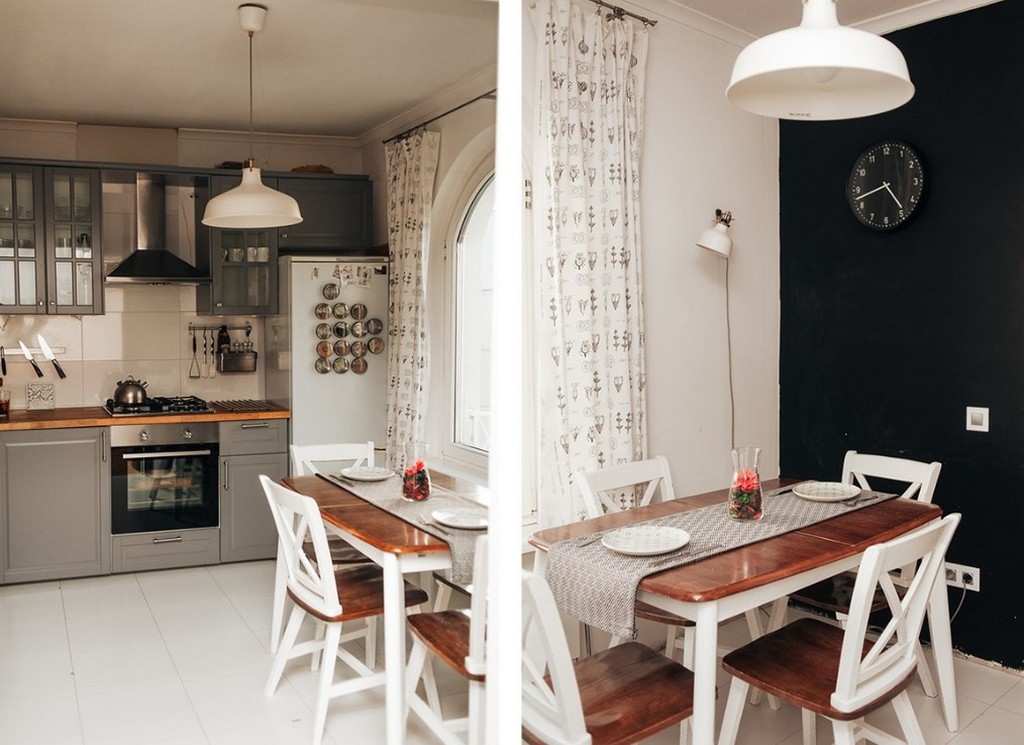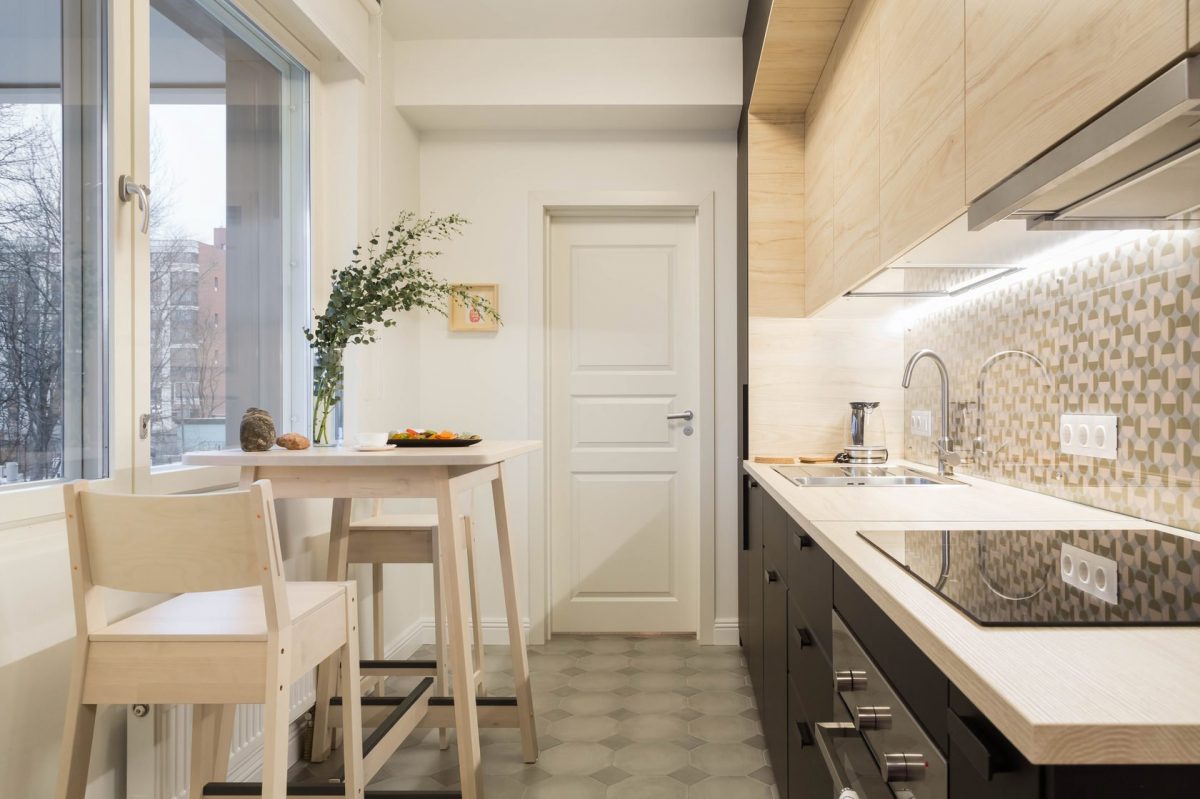 Планируя ремонт на маленькой кухне, рассмотри возможность увеличения пространства за счет объединения с соседними помещениями. Популярный сейчас прием – перепланировка в кухню-гостиную. Нельзя с уверенностью сказать, что ты получишь дополнительные квадратные метры, но это позволит «вынести» с территории кухни обеденную зону, оставив больше места для рабочей.