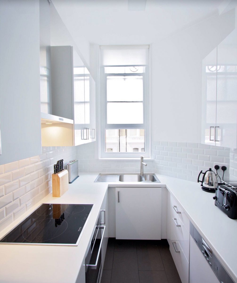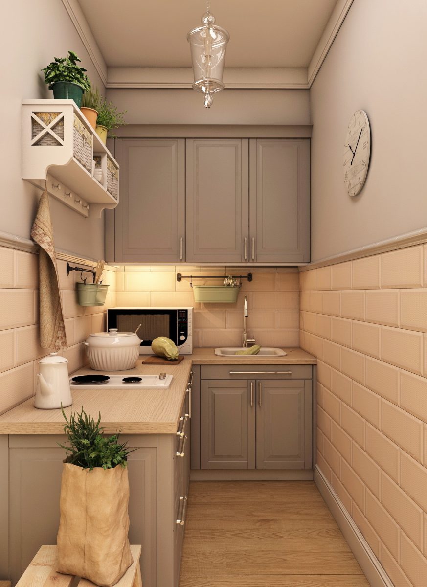 - Маленькая прямая кухня смотрится визуально легче в интерьере, но с точки зрения хранения менее практична.
