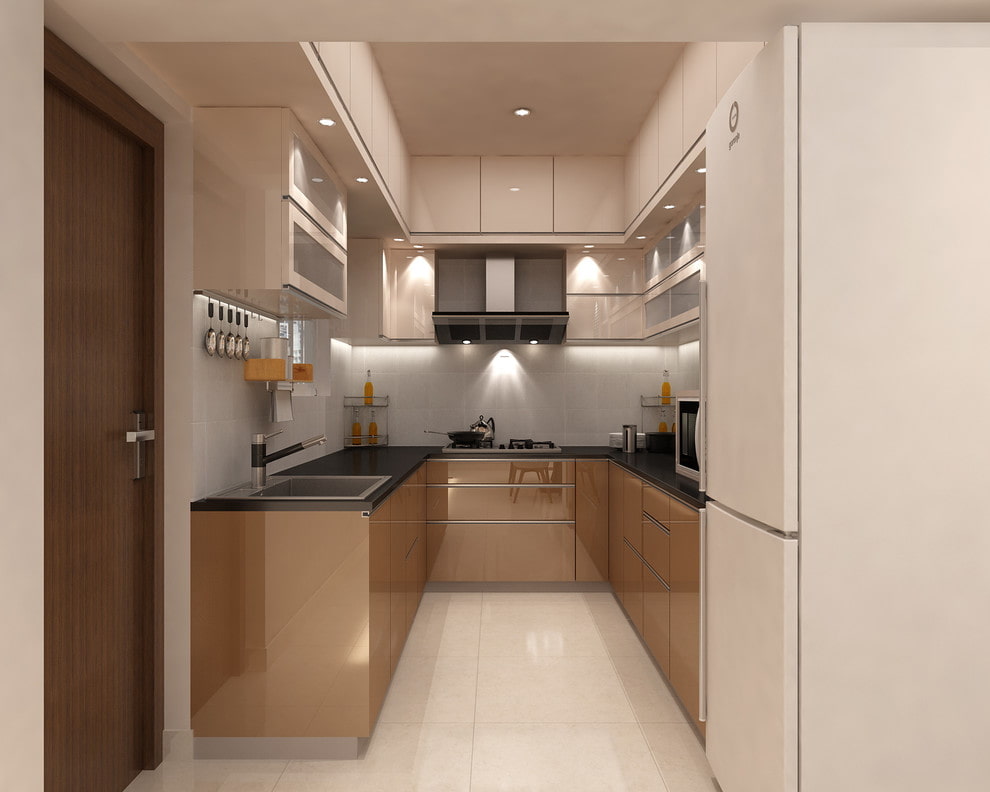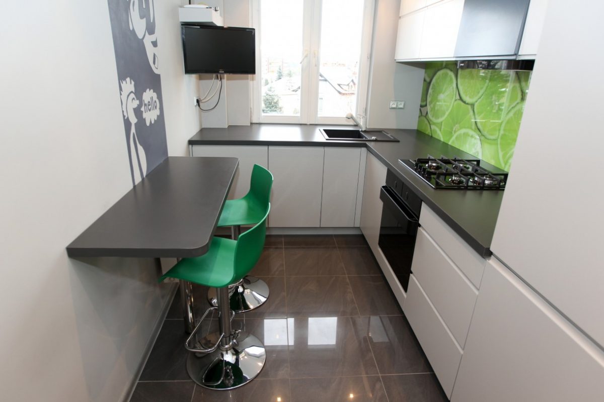 Такие места как фартук и поверхности кухонного гарнитура в маленькой кухне лучше оформить в глянце. Это значит, что фартук и гарнитур будут отражать свет и тем самым расширять площадь комнаты.