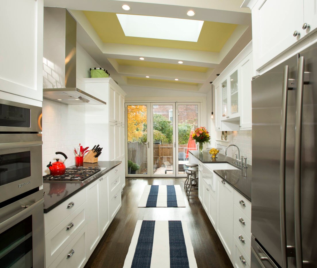 Мебель в 2 ряда – идеальный вариант обустройства узкого помещения. На одной стороне устанавливают плиту, мойку, стол для приготовления пищи, посудомоечную машину. Другая же предназначена для холодильника, духовки и микроволновой печи.