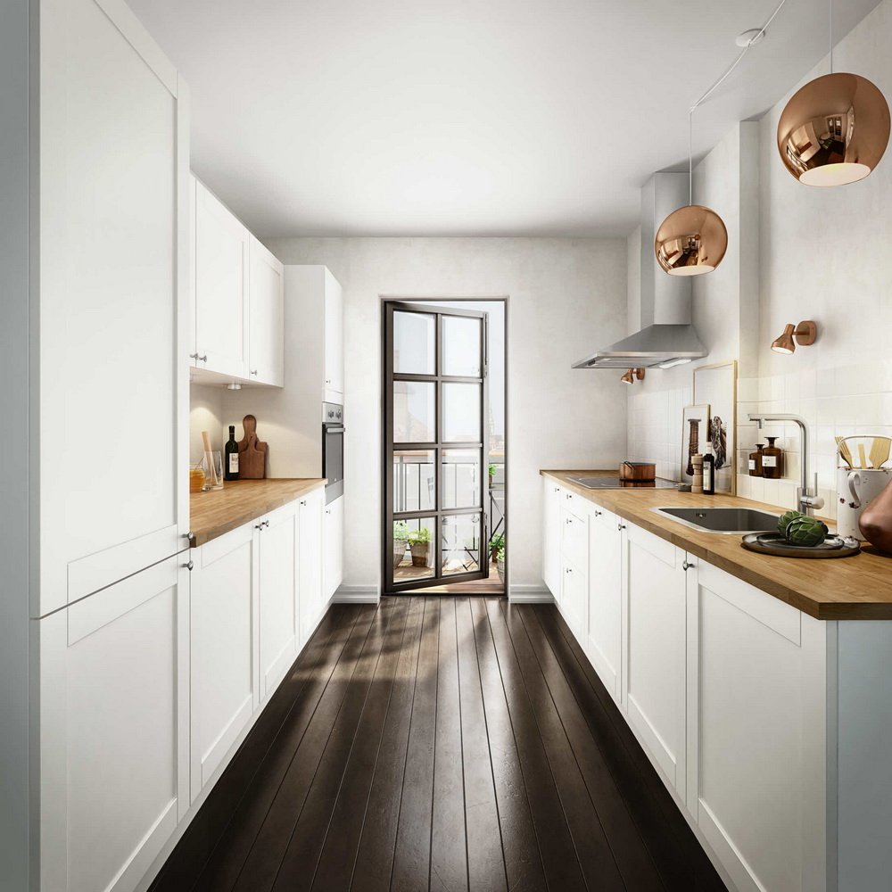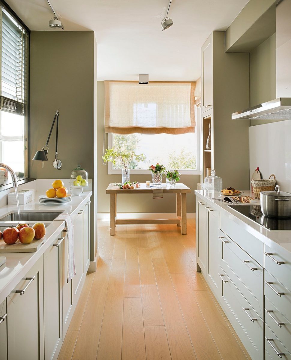 Этот вариант подойдёт для узкой и длинной кухни, в конце которой имеется окно или выход на балкон. Гарнитур, шкафы с бытовой техникой устанавливаются по двум сторонам вдоль стен параллельно друг другу.