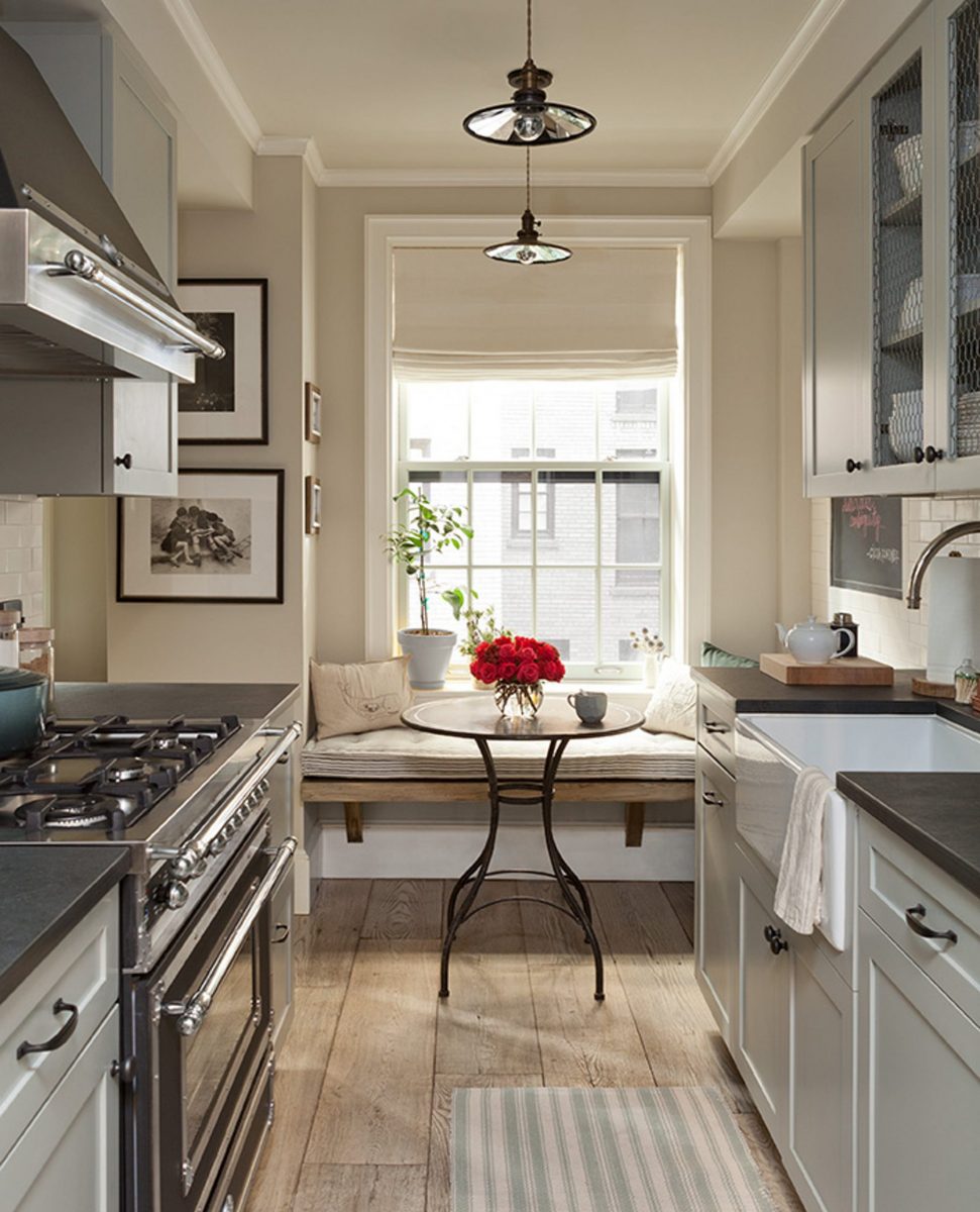 В маленькой узкой кухне проблематично найти место для обеденной зоны, так как после установки гарнитура остается узкий проход. Здесь может быть несколько вариантов, в зависимости от того, на сколько человек будет рассчитана обеденная зона: