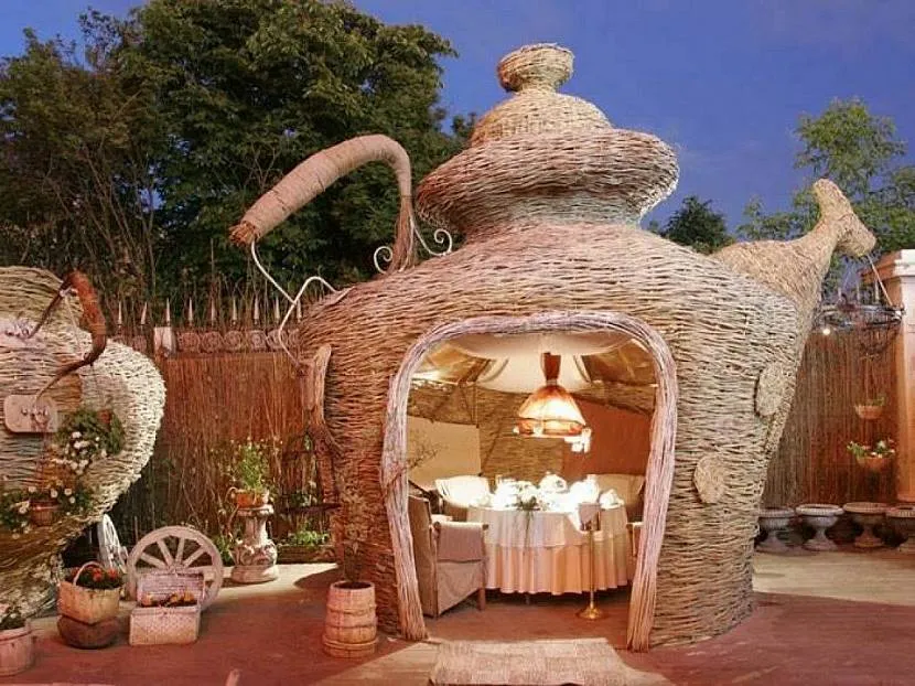 Современная мода эклектична. Не бойся экспериментировать, есть масса интересных решений.Плетеные беседки – легкие, красивые и элегантные. Они сочетают простоту и утонченность. Для их изготовления подойдут почти любые гибкие длинные ветви. Это ива, виноградная лоза, черемуха, камыш, орешник. Разные технологии плетения и оттенки коры делают такие беседки всегда уникальными.