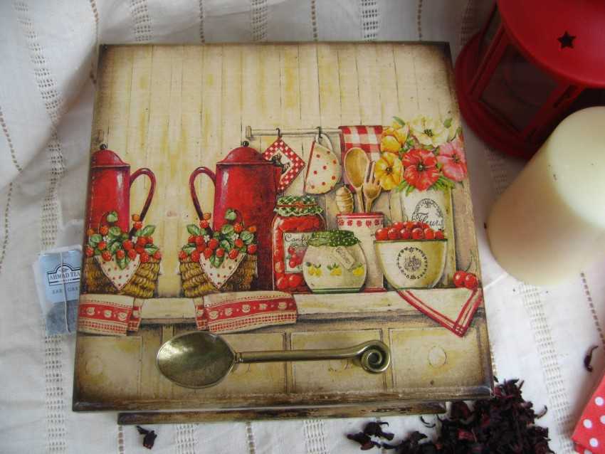 Кантри. В этот стиль отлично вписываются картинки для декупажа, изображающие сельскую жизнь и ее обитателей. Это могут быть пейзажи, изображения кухонной утвари, овощей, фруктов, домашних животных.