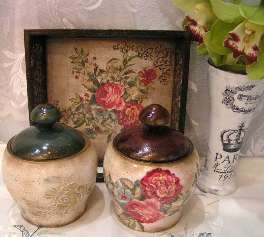 На фото ниже представлены некоторые варианты возможного преображения предметов с помощью декупажа.