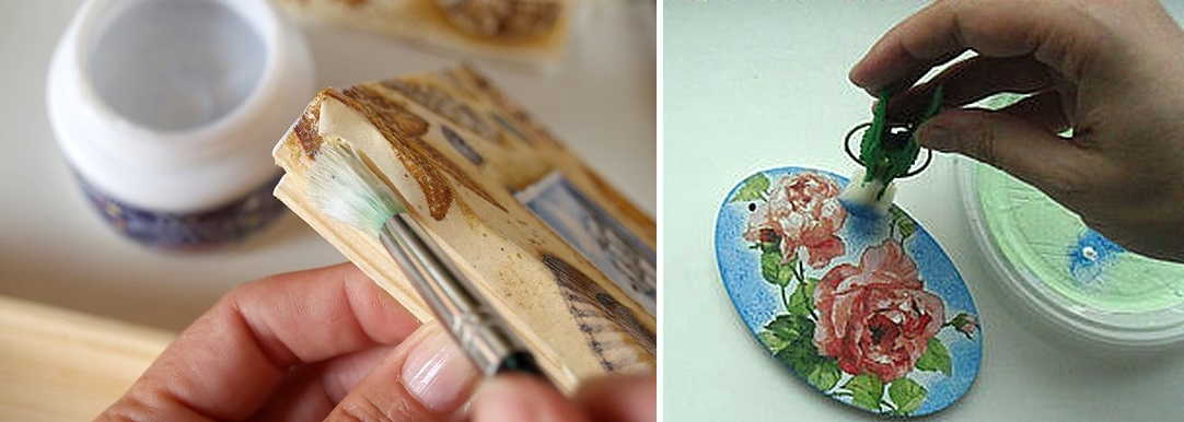 Затем кусок с изображением располагается на нужном предмете. Кисточкой набрать клей и мелкими шажками сантиметр за сантиметром пройтись по всему кусочку и вокруг него. Клей пропитает салфетку, и она намертво сольется с поверхностью. После высыхания нужно покрыть декупаж прозрачным лаком.