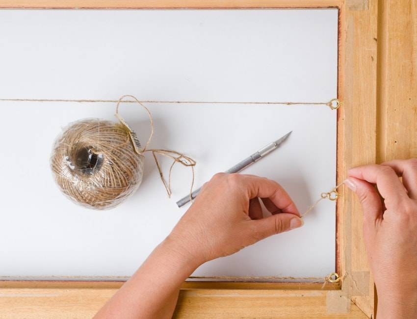 Разрезаем бечевку по ширине рамки и натягиваем поочередно каждый отрезок.