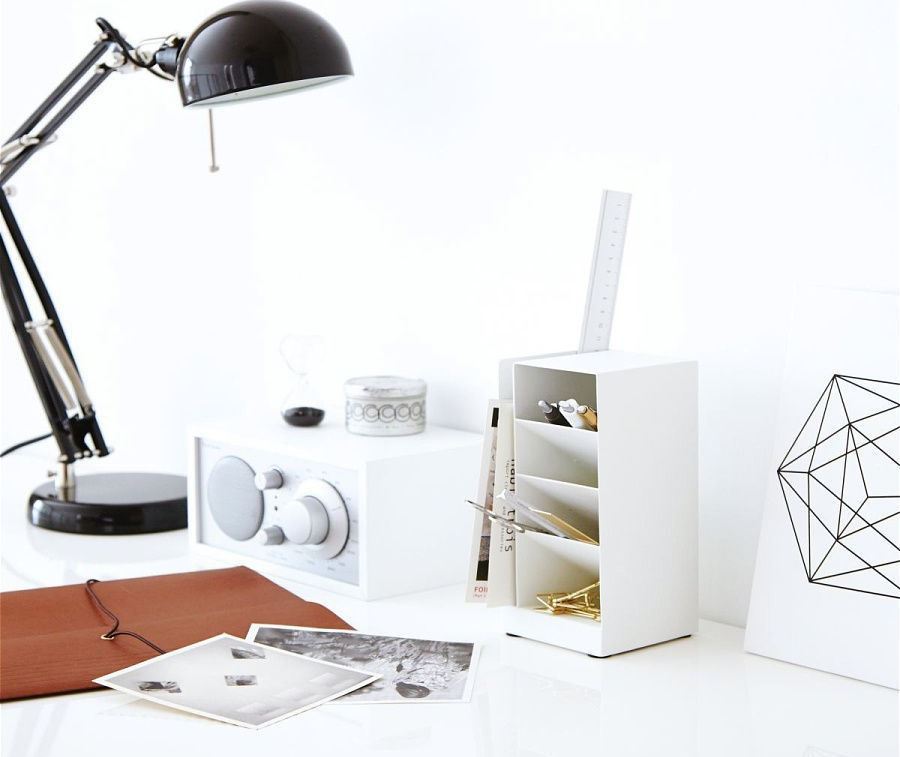 Этот миниатюрный органайзер станет отличным решением для небольшого рабочего стола, где весьма ограничено место. 4 ячейки сделаны под углом, что исключает риск выпадения канцелярских принадлежностей. Выполнен в белом цвете в форме башенки. Для изготовления применяется сталь. Заявленные габариты: 90х90х200 мм. Следует отметить, что устанавливать конструкцию можно как горизонтально, так и вертикально. Вес – 0,8 кг.