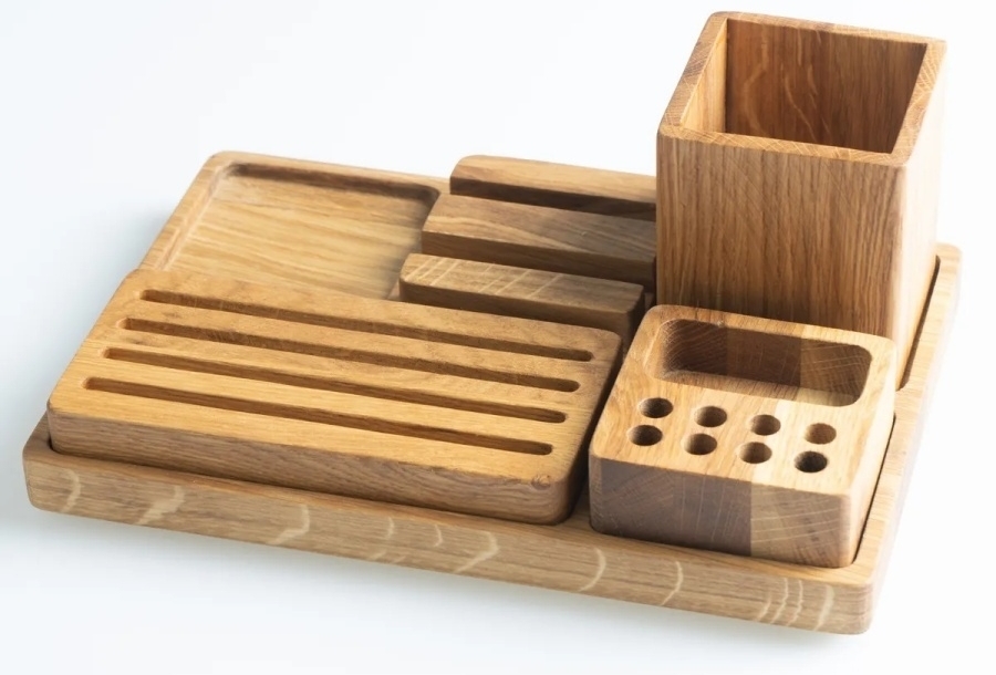 Для изготовления этой конструкции применяется натуральное дерево. Стильное и многофункциональное приспособление, которое относится к категории экологичных. Станет отличным дополнением к имеющемуся интерьеру. Устройство делается вручную из массива дуба. Продукт от иностранного производителя может выступать в качестве подарка, за счет наличия красивой упаковки. Белорусский производитель предусмотрел много ячеек, которые можно заполнить по своему усмотрению. Отличный способ организовать рабочее пространство, и поместить все необходимые канцелярские предметы в одном месте. Прекрасный способ порадовать не только себя, но и своих близких, а также коллег.