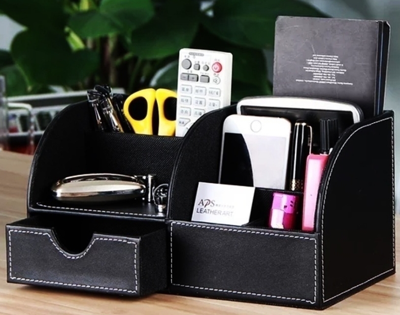Этот стильный настольный органайзер оснащен не только несколькими ячейками, но и выдвижным ящичком. Отличный способ для размещения всех необходимых канцелярских принадлежностей в одном месте. В основе лежит использование 7 отделений. Для изготовления применяется экокожа. Отличное решение не только для личного пользования, но и работы. Поставляется в красивой упаковке, которая может использоваться в качестве подарочной. Внутри ячеек расположены замшевые вставки, которые просты в последующем уходе. Вес – 0,9 кг. Размеры: 145х145 мм.