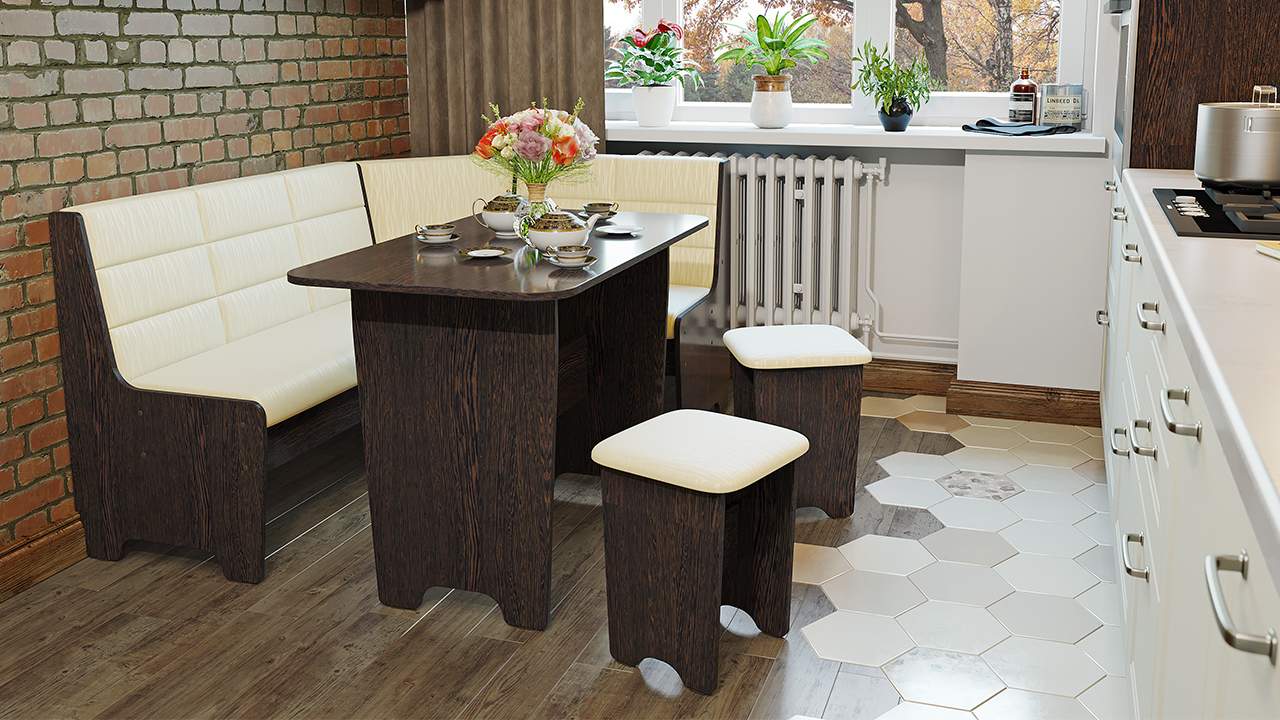 - классический на 4 или более персоны — конечно, в некоторых случаях не обойтись без стандартного варианта. Например, если в семье 4 или больше человек. Да, он занимает много места, но правильная планировка кухни поможет сгладить этот эффект;