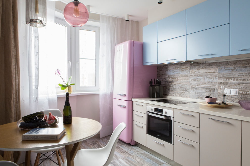 Начнём с холодильника. Где его лучше разместить в данном случае? Ведь кухня 8 квадратных метров — совсем небольшое помещение, что делает холодильник особенно громоздким на вид.