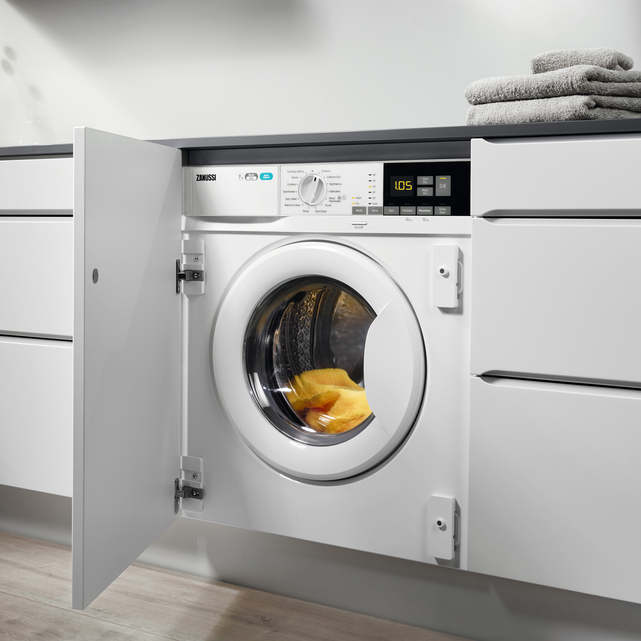 А где разместить стиральную машинку, если вы решили поставить её именно на кухне 8,6 кв. м? Дизайн в таком случае предполагает несколько вариантов: