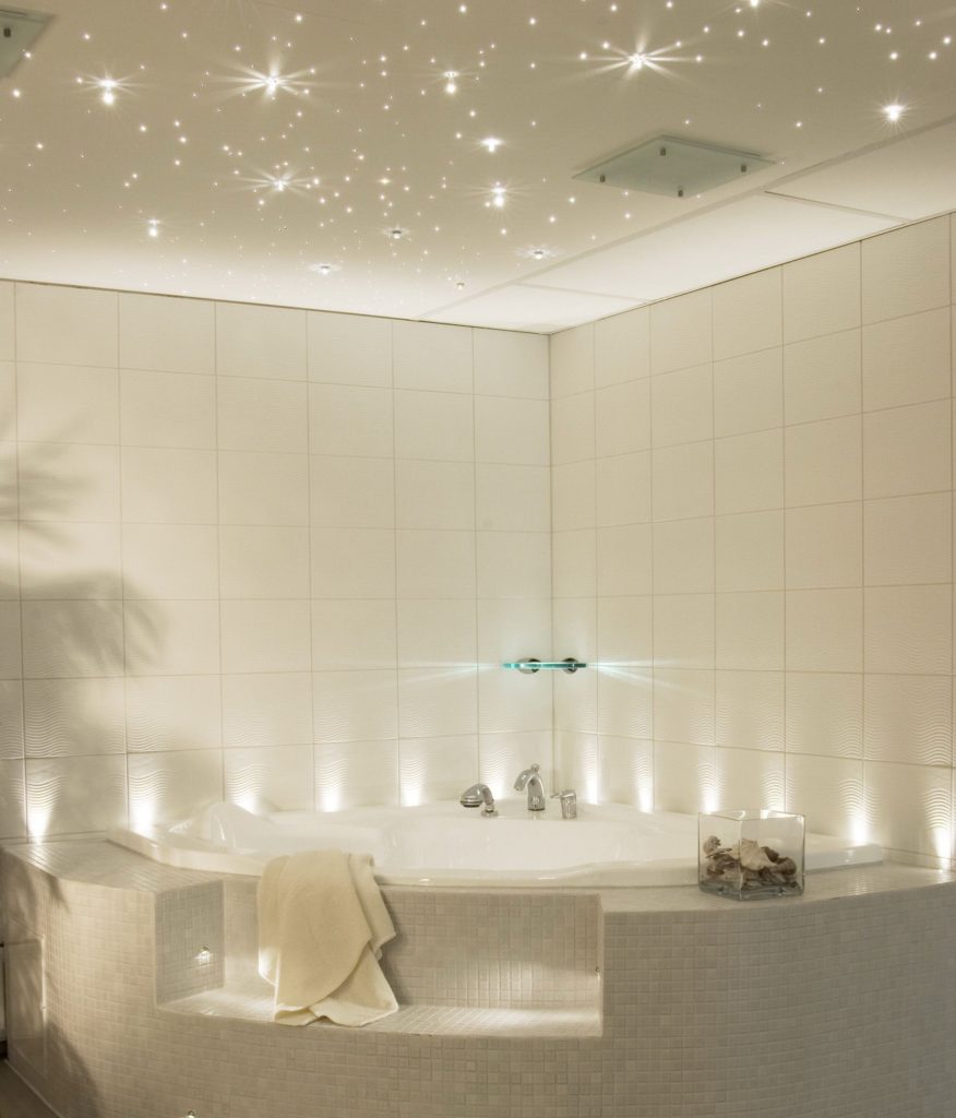 Подсветка натяжного потолка внесет немного разнообразия в интерьер ванной