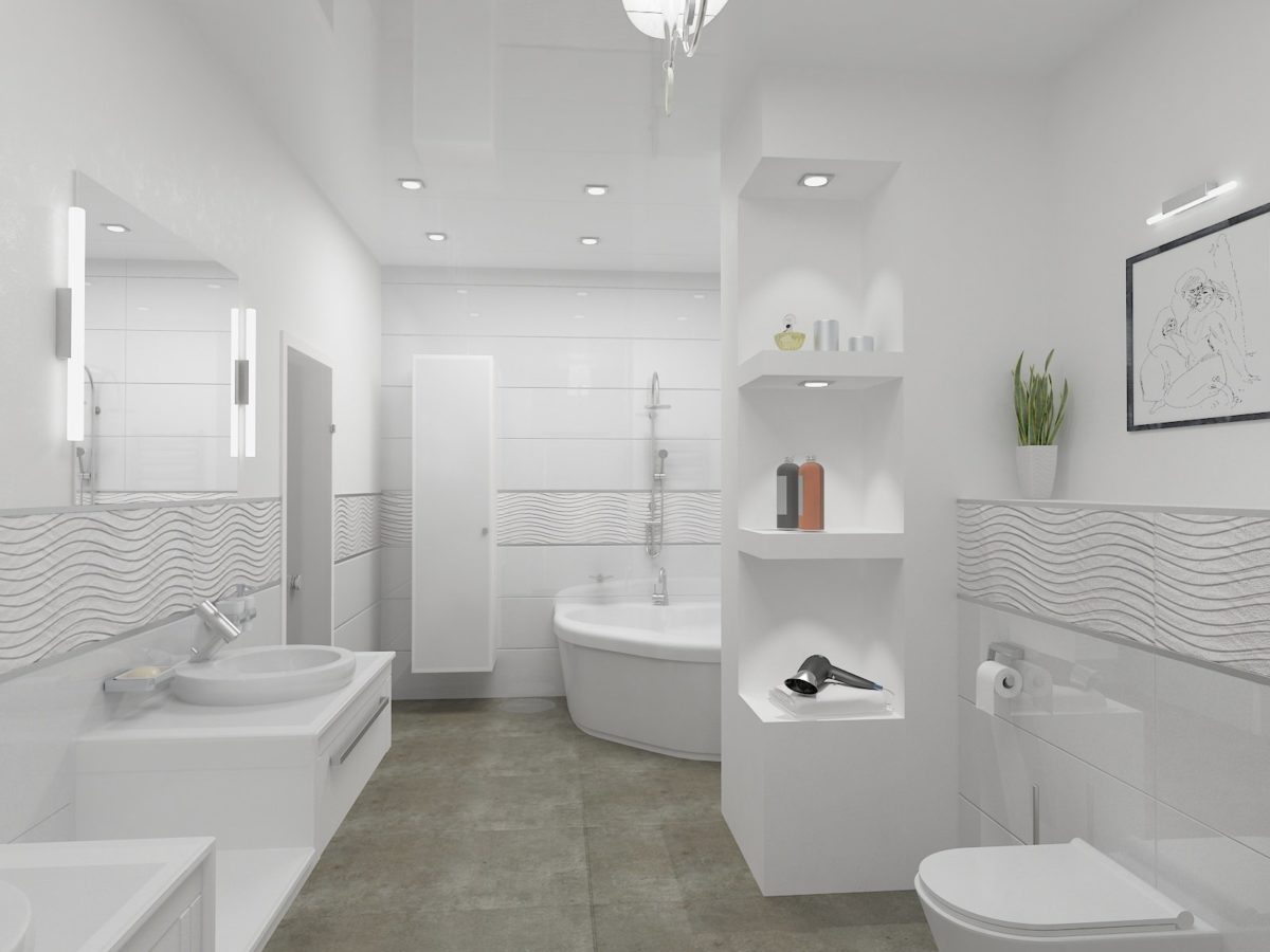 Сделать монохромный интерьер ярким и выразительным – задача не из лёгких. Если ванная полностью выдержана в белом цвете, нужно играть на контрасте фактур, текстур и материалов.