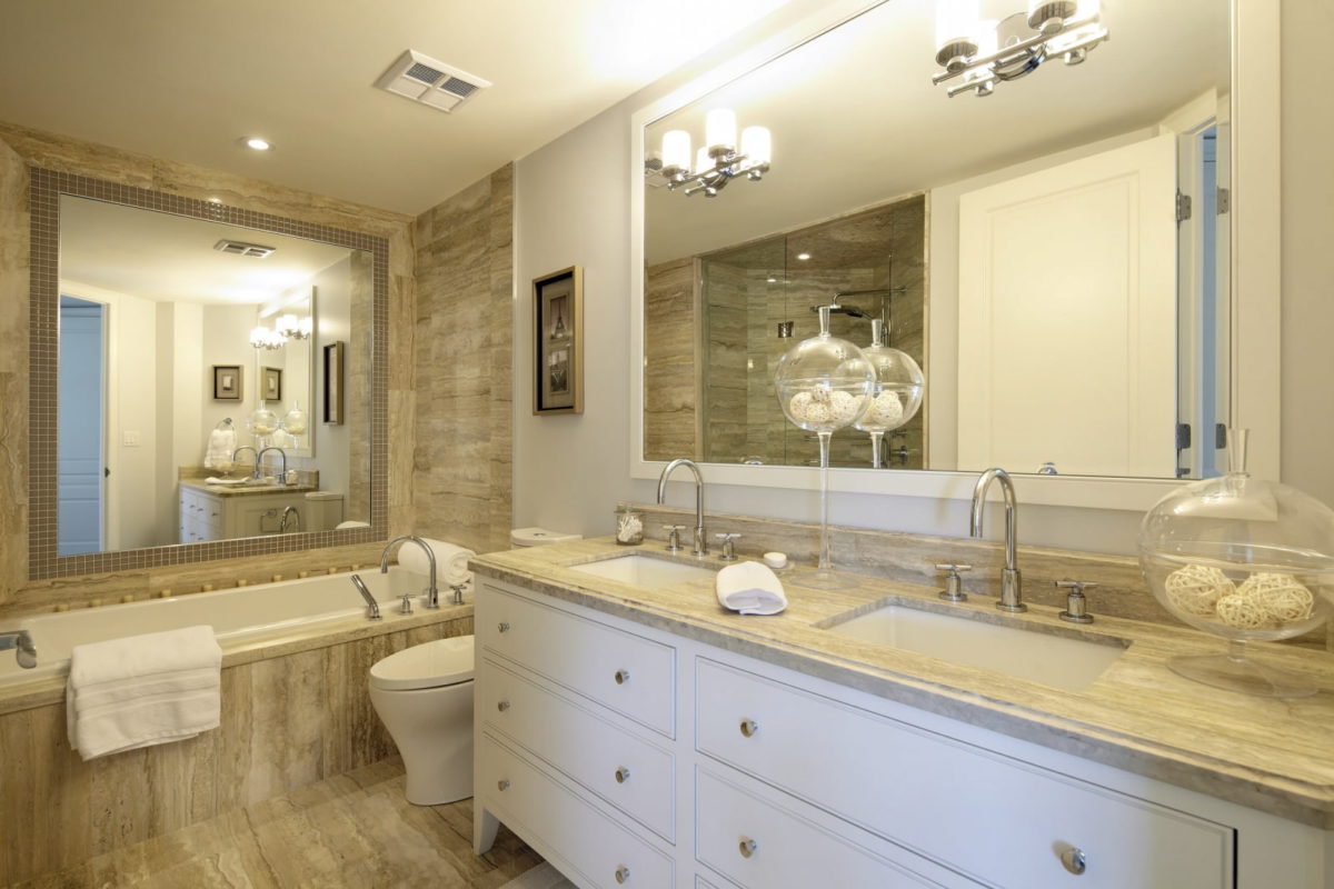 Светлые тона являются базовыми. Бежевая ванная комната никогда не выйдет из моды.