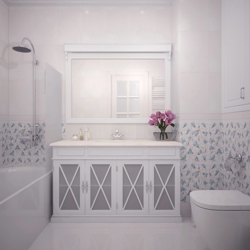 В классическом стиле чаще встречаются белые, сливочные или бежевые ванные. При этом аристократичность светлых оттенков хорошо подчёркивает благородный цвет смесителей из меди, бронзы или латуни. Ванная в светлых тонах в стиле неоклассики выглядит более современно и может быть оформлена с применением контрастных цветов на фасадах мебели и плитке.