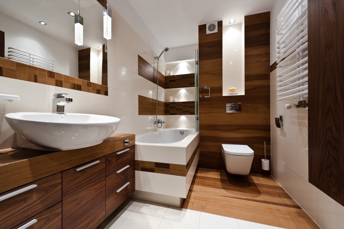 Дизайн ванной комнаты в бежевом цвете с имитацией дерева