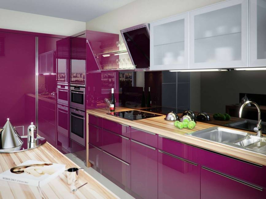 Эффектно будет выглядеть кухонный гарнитур с лиловыми фасадами. Но другая мебель при этом должна быть простой и неброской, чтобы не вызвать впечатления нагроможденности. Если же лиловыми будут стены, то мебель нужно выбирать светлую. Для кухни в стиле хай-тек стало классическим сочетание лилового с белым.