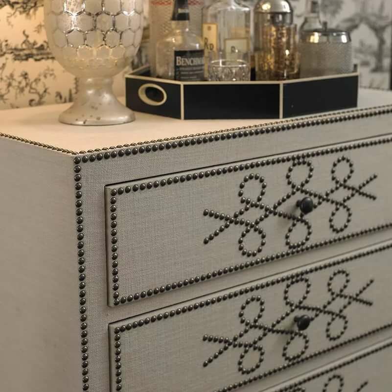 Используя мебельные гвозди с круглыми шляпками, можно надоевший комод из икеа превратить в уникальный предмет интерьера. Недорогие гвозди разных видов с рельефными и гладкими шляпками, разного цвета латуни, золота и серебра открывают широкие возможности для воплощения оригинальных дизайнерских идей, создавать уникальные витиеватые или геометрические орнаменты. Главное – выбирать гвозди, чтобы их длина не была больше толщины фасада.