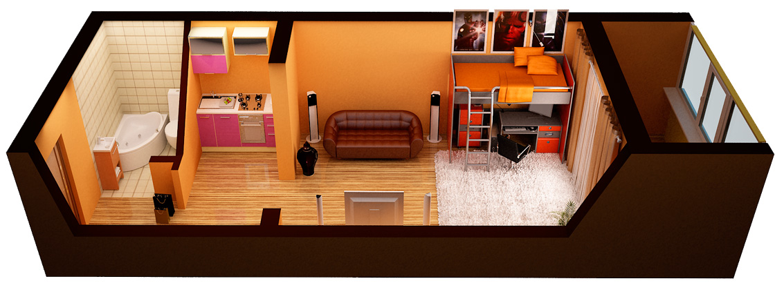 В принципе, такую квартиру можно просто обставить необходимой мебелью и не тратить время на разработку дизайна. Однако, в таком случае, большая часть пространства останется невостребованной. Существует более рациональный способ использования имеющейся площади, например, построить своего рода, второй этаж и обустроить там спальню. Таким образом, функционал квартиры значительно увеличится. Также можно изменить дизайн проект малогабаритной квартиры
