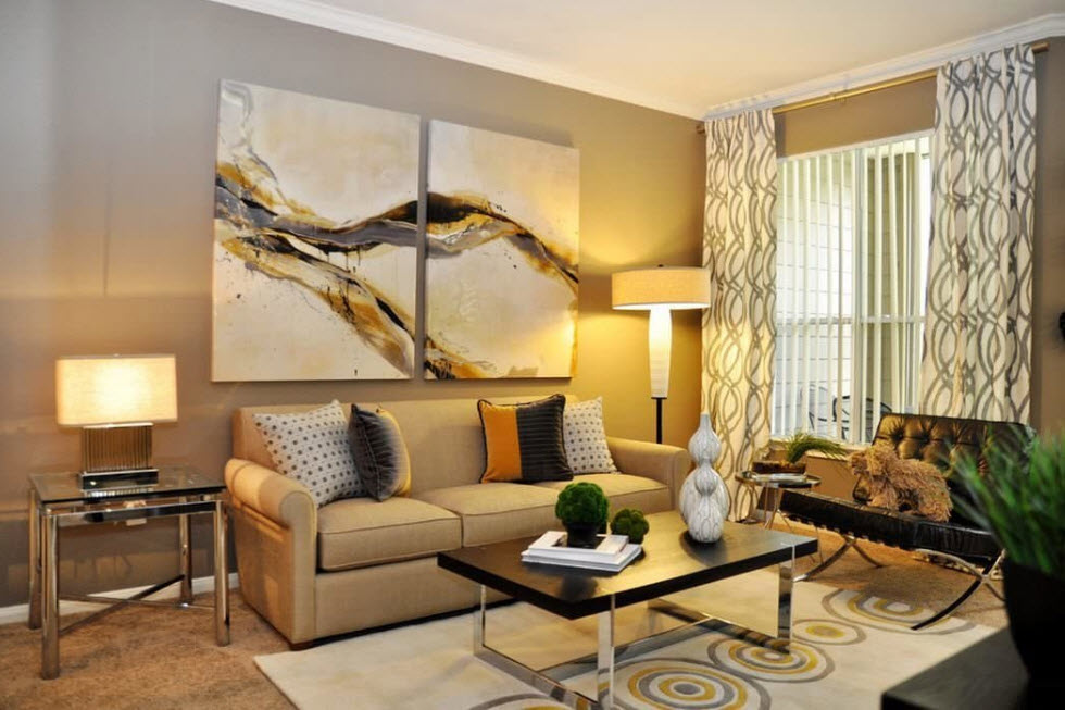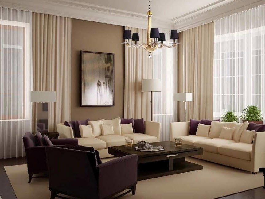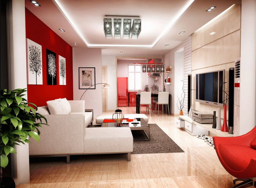 Гостиную в современном стиле прекрасно дополнят светлые тона при оформлении интерьера. Комната, как правило, оформляется в пастельных оттенках, при использовании ярких цветовых акцентов.