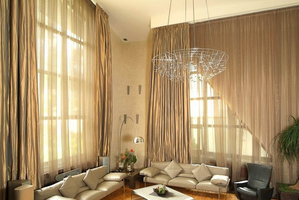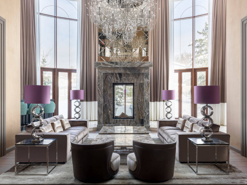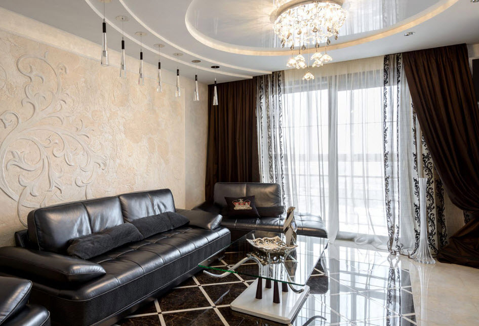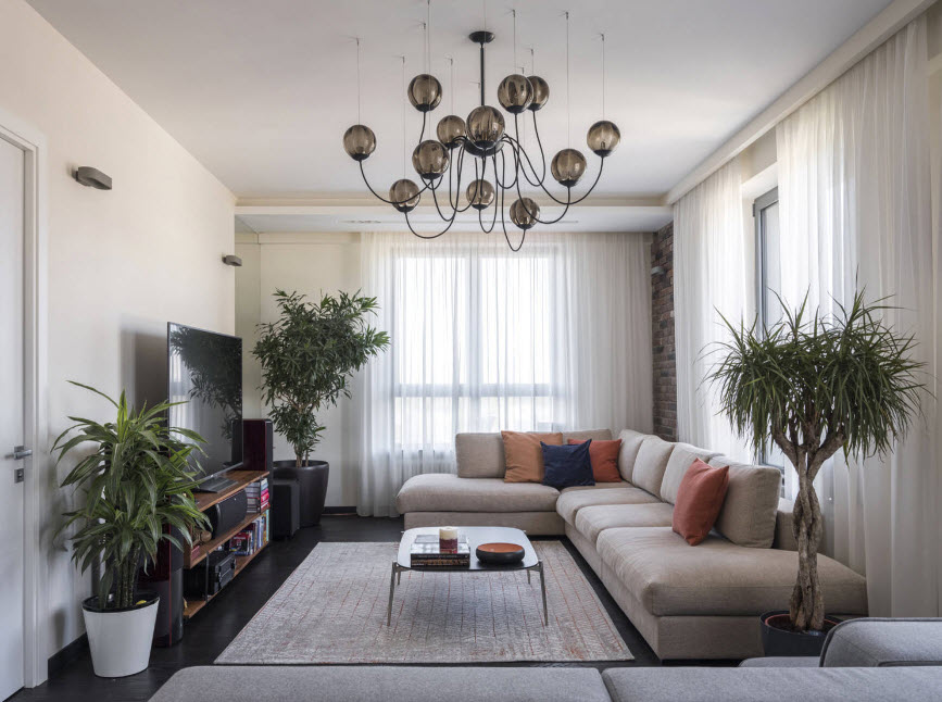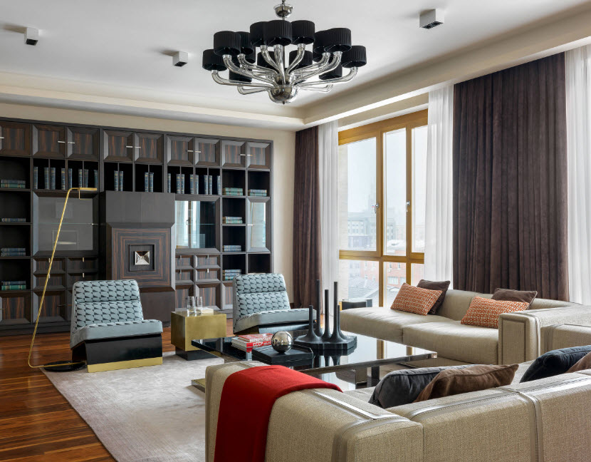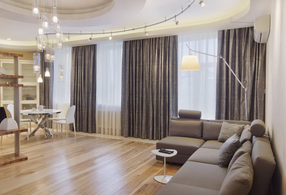 Просторная гостиная – здесь важно, чтобы источников света было несколько, можно использовать разные типы освещения, например, центральная люстра и точечная подсветка по периметру комнаты.