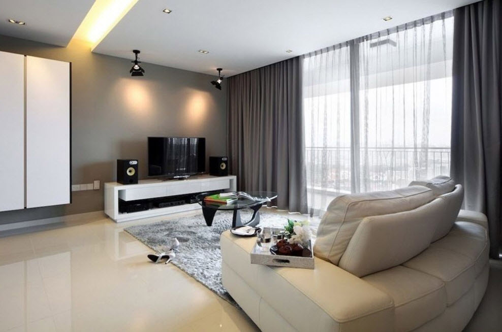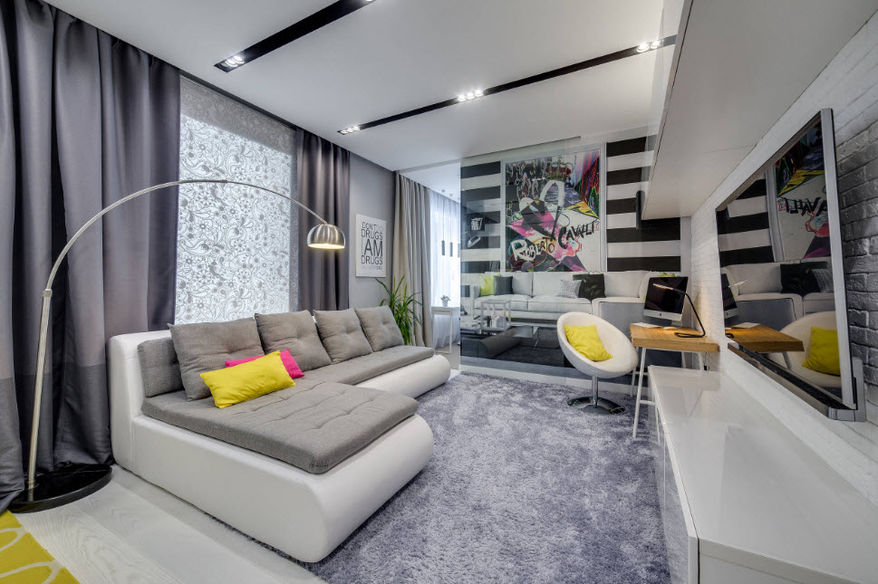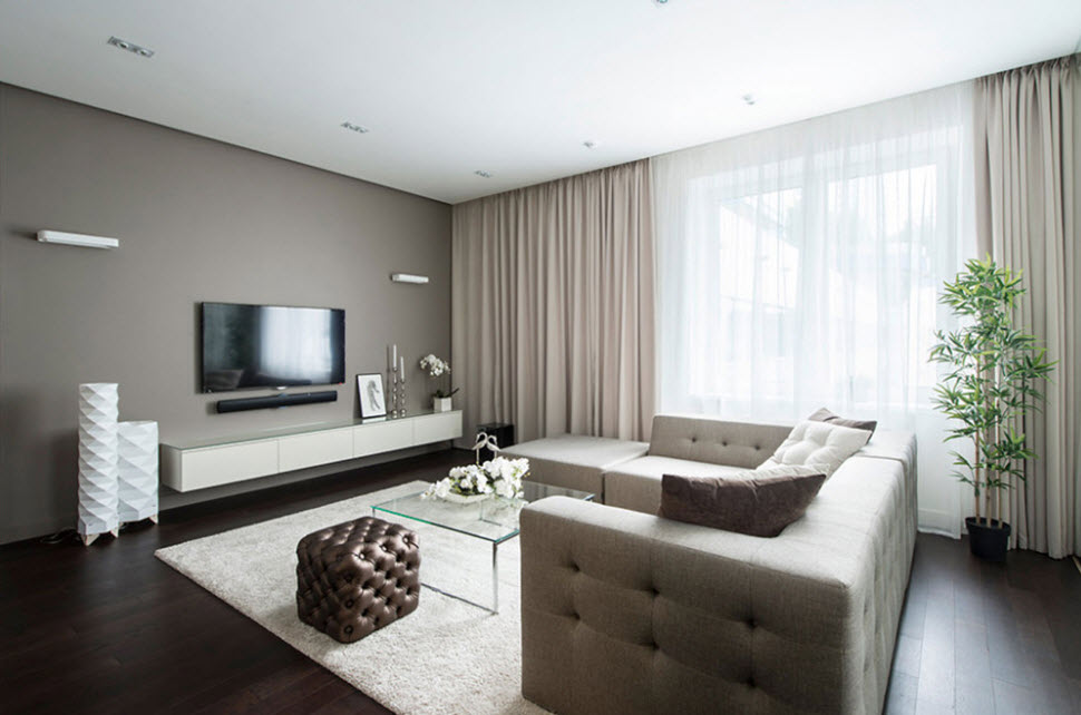 В стиле минимализм, два цвета – это базовая основа и цветовой акцент (можно использовать не только яркий оттенки, но и глубокие). Самые подходящие цвета для оформления гостиной в стиле минимализм – черный, серый и белый. Для цветовых акцентов прекрасно подходят: желтый, голубой и красный.
